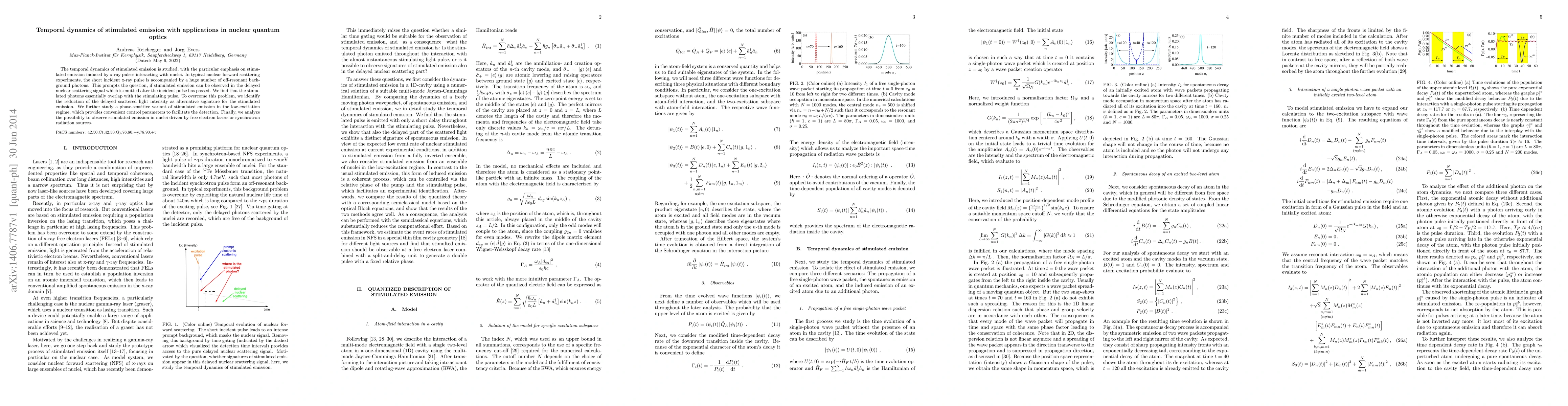 This paper investigates the temporal dynamics of stimulated emission in nuclear quantum optics, focusing on x-ray pulses interacting with nuclei. It proposes a method to detect stimulated emission by observing the reduction in delayed scattered light intensity, and explores phase-sensitive variants for better control and detection.