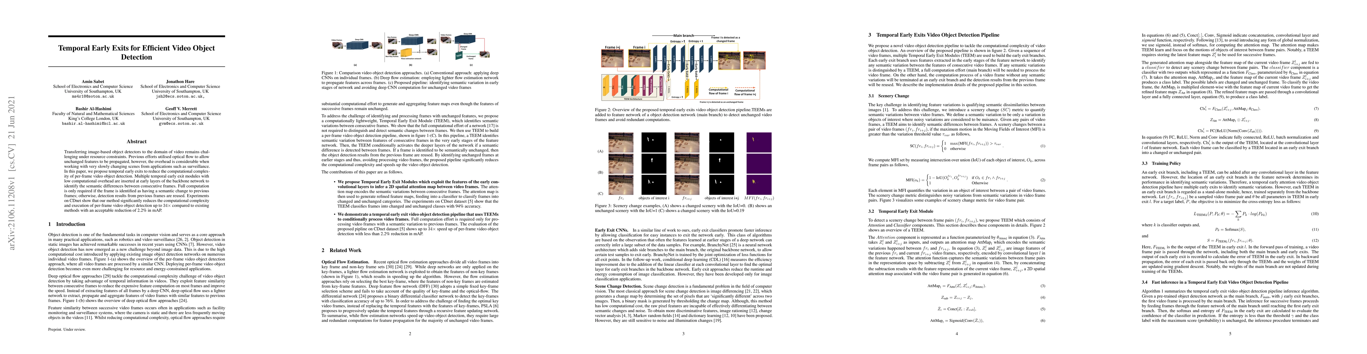 Transferring image-based object detectors to the domain of video remains challenging under resource constraints. Previous efforts utilised optical flow to allow unchanged features to be propagated, however, the overhead is considerable when working with very slowly changing scenes from applications such as surveillance. In this paper, we propose temporal early exits to reduce the computational complexity of per-frame video object detection. Multiple temporal early exit modules with low computational overhead are inserted at early layers of the backbone network to identify the semantic differences between consecutive frames. Full computation is only required if the frame is identified as having a semantic change to previous frames; otherwise, detection results from previous frames are reused. Experiments on CDnet show that our method significantly reduces the computational complexity and execution of per-frame video object detection up to $34 \times$ compared to existing methods with an acceptable reduction of 2.2\% in mAP.