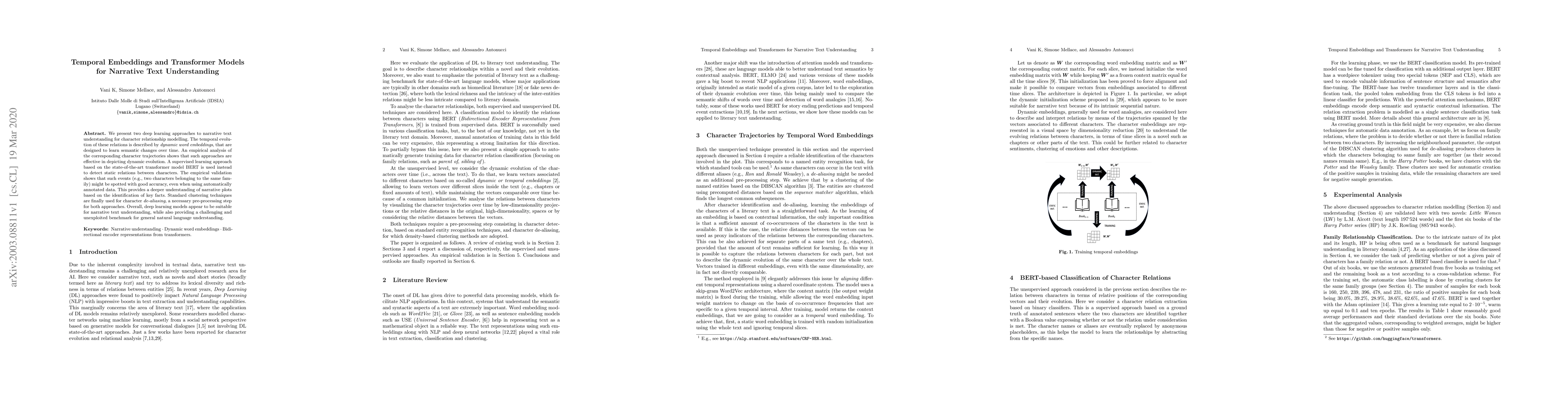 This paper explores two deep learning methods for understanding narrative text, focusing on character relationship modeling. It employs dynamic word embeddings to capture temporal changes in character relations and uses BERT for detecting static character relations, demonstrating effective narrative plot comprehension.