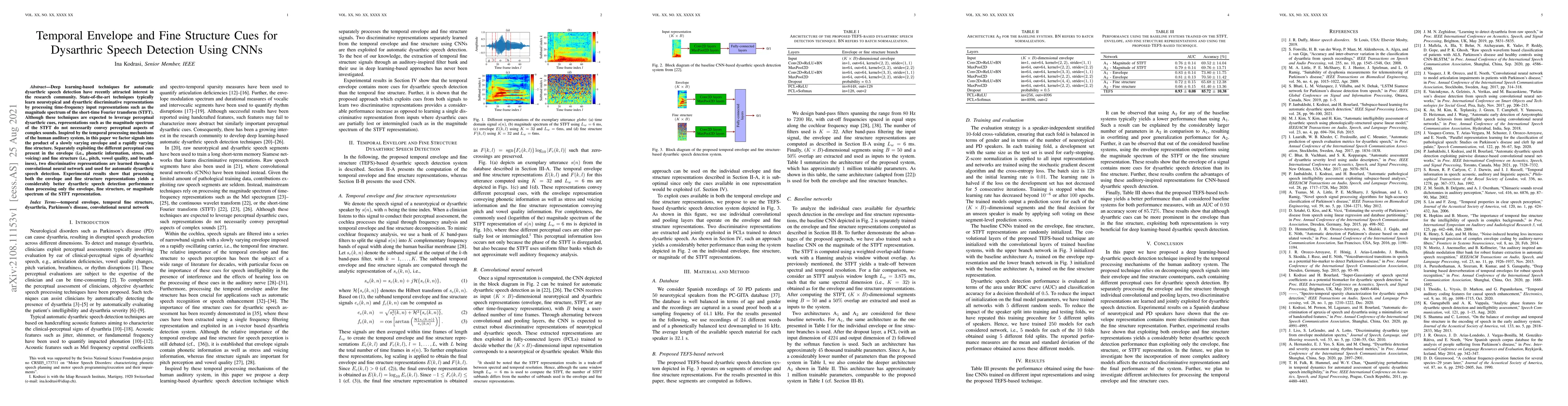 This paper explores deep learning methods for detecting dysarthric speech by separately processing temporal envelope and fine structure cues using convolutional neural networks (CNNs). It demonstrates improved detection performance by leveraging both envelope and fine structure representations compared to traditional magnitude spectrum methods.