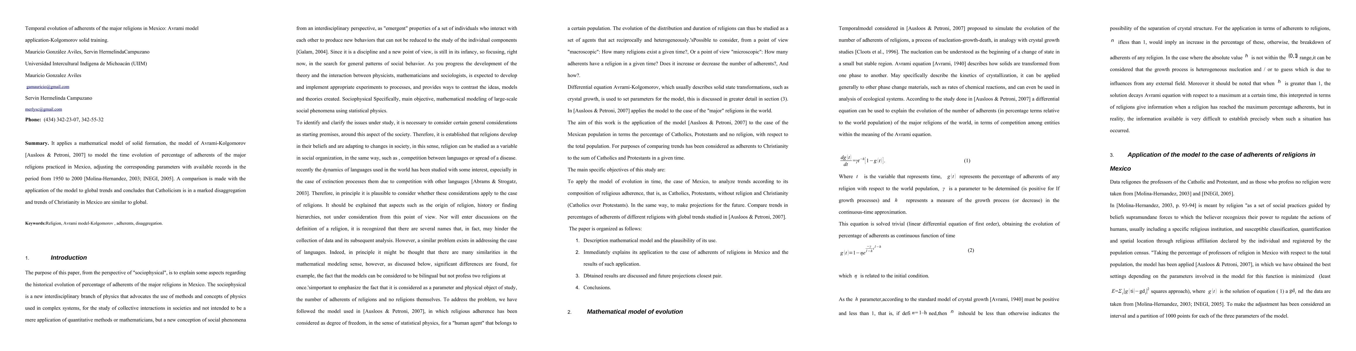 This paper uses the Avrami-Kolgomorov model, originally for solid formation, to analyze the temporal evolution of major religious adherents in Mexico from 1950 to 2000. The study finds that Catholicism is declining while Christianity trends in Mexico align with global trends.