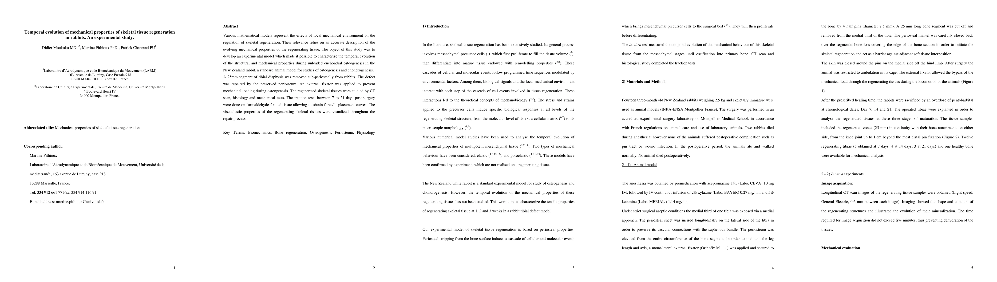 Various mathematical models represent the effects of local mechanical environment on the regulation of skeletal regeneration. Their relevance relies on an accurate description of the evolving mechanical properties of the regenerating tissue. The object of this study was to develop an experimental model which made it possible to characterize the temporal evolution of the structural and mechanical properties during unloaded enchondral osteogenesis in the New Zealand rabbit, a standard animal model for studies of osteogenesis and chondrogenesis. A 25mm segment of tibial diaphysis was removed sub-periosteally from rabbits. The defect was repaired by the preserved periosteum. An external fixator was applied to prevent mechanical loading during osteogenesis. The regenerated skeletal tissues were studied by CT scan, histology and mechanical tests. The traction tests between 7 to 21 days post-surgery were done on formaldehyde-fixated tissue allowing to obtain force/displacement curves. The viscoelastic properties of the regenerating skeletal tissues were visualized throughout the repair process.