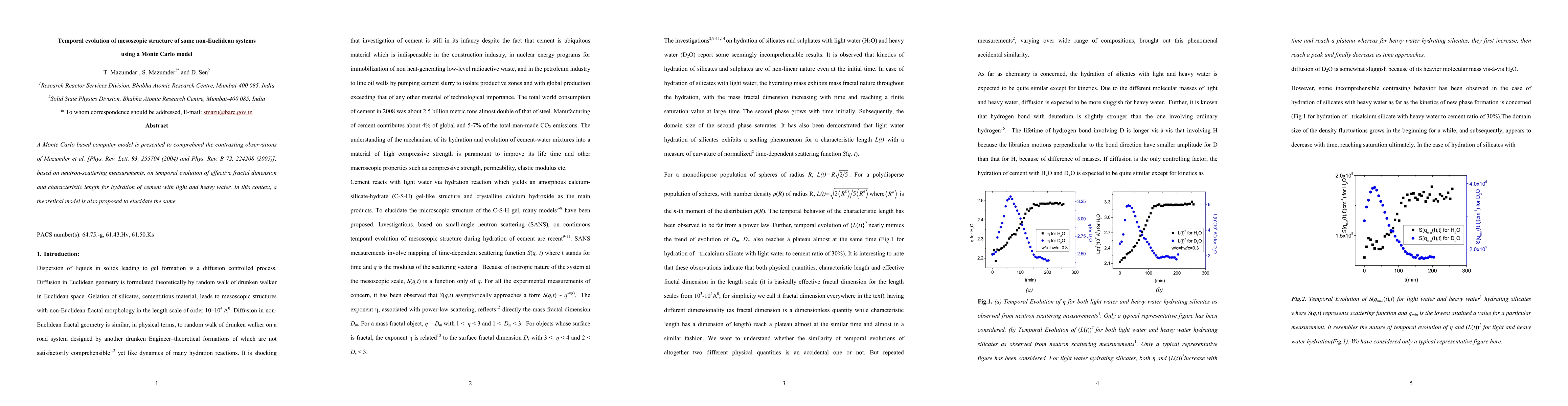 A Monte Carlo model is used to study the temporal evolution of mesoscopic structure in non-Euclidean systems, specifically hydration of cement with light and heavy water, aiming to explain contrasting observations from neutron-scattering measurements.