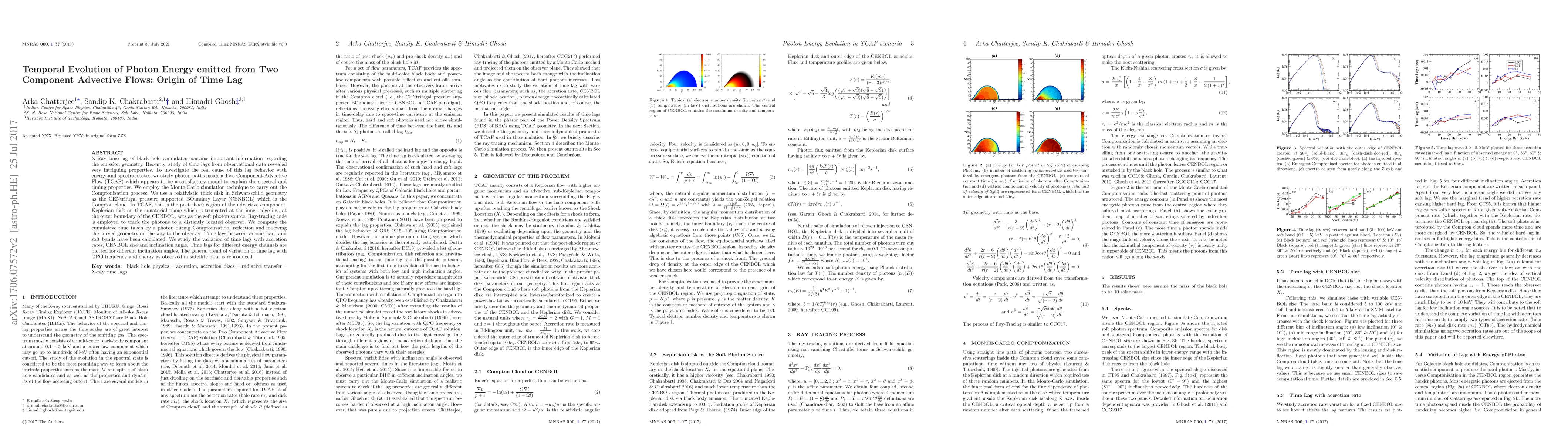 This paper investigates the temporal evolution of photon energy in Two Component Advective Flows (TCAF) to understand the origin of time lags in X-ray emissions from black hole candidates. Using Monte-Carlo simulations and ray-tracing, it models photon paths through a relativistic thick disk and a Keplerian disk, finding that the time lags vary with accretion rates, CENBOL size, and inclination angle, reproducing observed trends in satellite data.