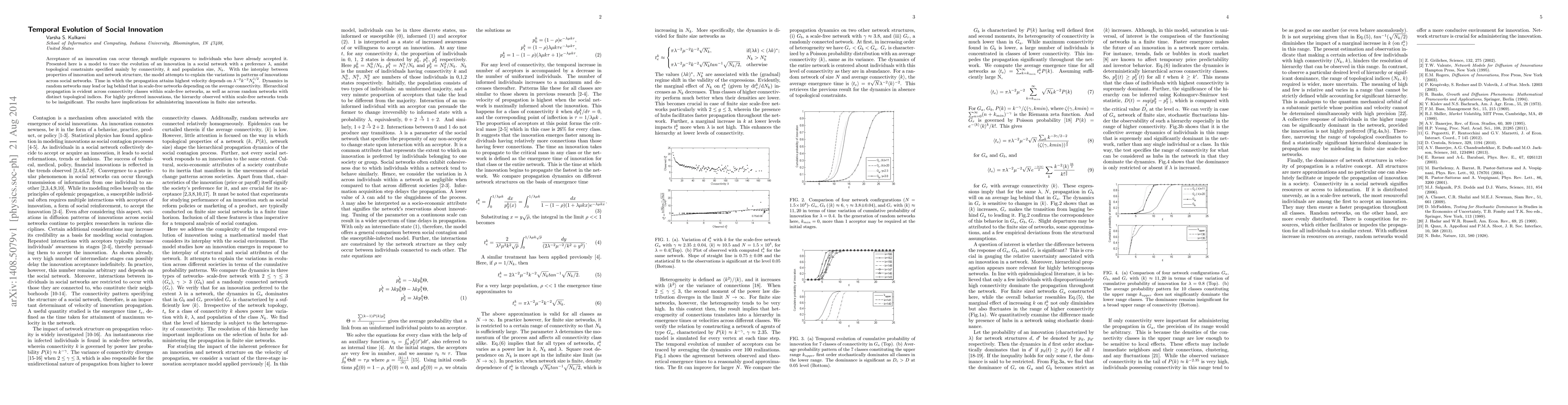 Acceptance of an innovation can occur through mutliple exposures to individuals who have already accepted it. Presented here is a model to trace the evolution of an innovation in a social network with a preference $\lambda$, amidst topological constraints specified mainly by connectivity, $k$ and population size, $N_k$. With the interplay between properties of innovation and network structure, the model attempts to explain the variations in patterns of innovations across social networks. Time in which the propagation attains highest velocity depends on $\lambda^{-2}k^{-2}N_{k}^{1/2}$. Dynamics in random networks may lead or lag behind that in scale-free networks depending on the average connectivity. Hierarchical propagation is evident across connectivity classes within scale-free networks, as well as across random networks with distinct topological indices. For highly preferred innovations, the hierarchy observed within scale-free networks tends to be insignificant. The results have implications for administering innovations in finite size networks.
