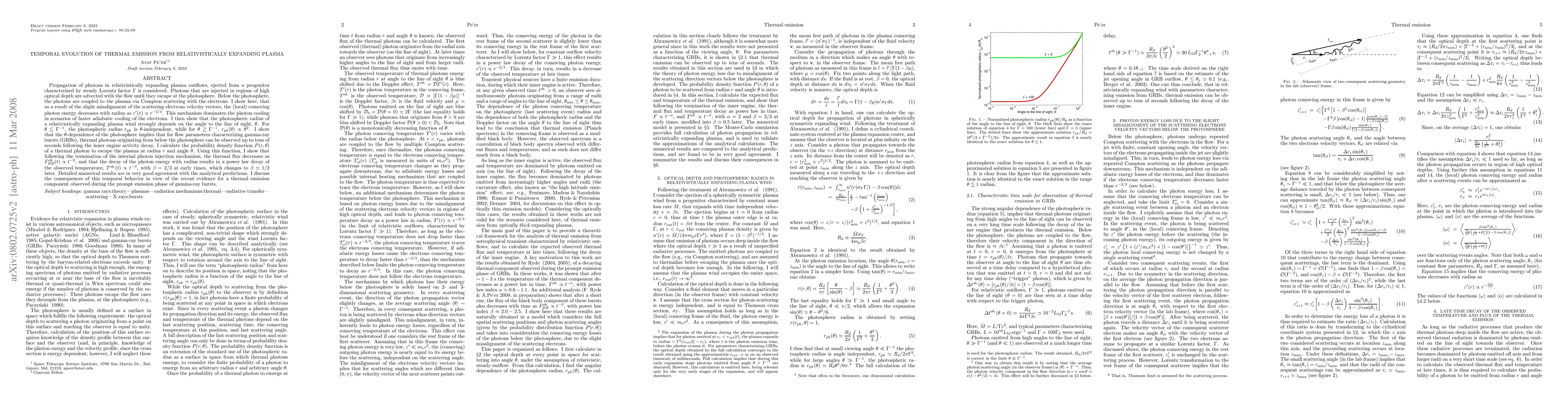 This paper investigates the temporal evolution of thermal emission from relativistically expanding plasma, showing that photon cooling is dominated by the misalignment of scattering electrons. It demonstrates that the photosphere's radius depends on the angle to the line of sight, leading to observable thermal photons from below the photosphere for several seconds post-activity. The study concludes with analytical predictions showing a thermal flux decay and observed temperature behavior that align well with numerical results.