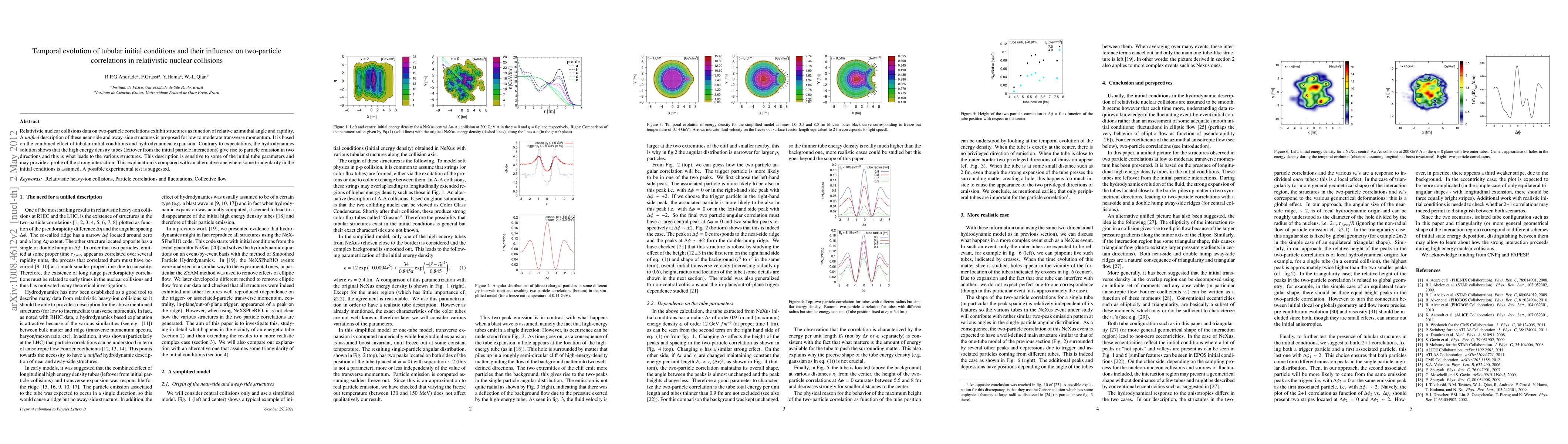 Relativistic nuclear collisions data on two-particle correlations exhibit structures as function of relative azimuthal angle and rapidity. A unified description of these near-side and away-side structures is proposed for low to moderate transverse momentum. It is based on the combined effect of tubular initial conditions and hydrodynamical expansion. Contrary to expectations, the hydrodynamics solution shows that the high energy density tubes (leftover from the initial particle interactions) give rise to particle emission in two directions and this is what leads to the various structures. This description is sensitive to some of the initial tube parameters and may provide a probe of the strong interaction. This explanation is compared with an alternative one where some triangularity in the initial conditions is assumed. A possible experimental test is suggested.