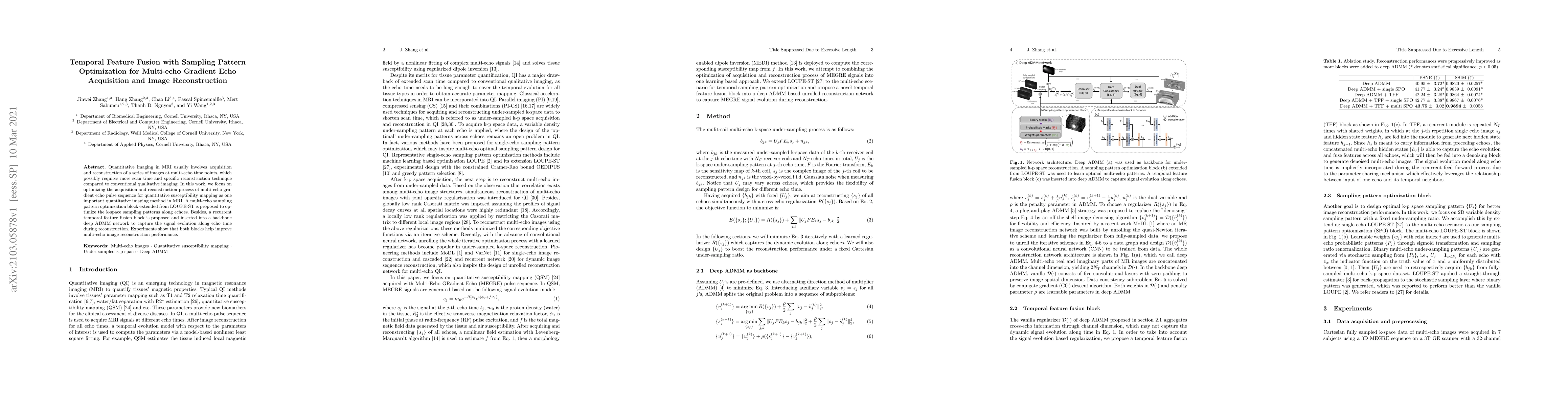 This paper proposes an optimized sampling pattern and a recurrent temporal feature fusion technique to enhance the reconstruction of multi-echo gradient echo MRI images for quantitative susceptibility mapping. The results demonstrate improved image reconstruction performance through these innovations.