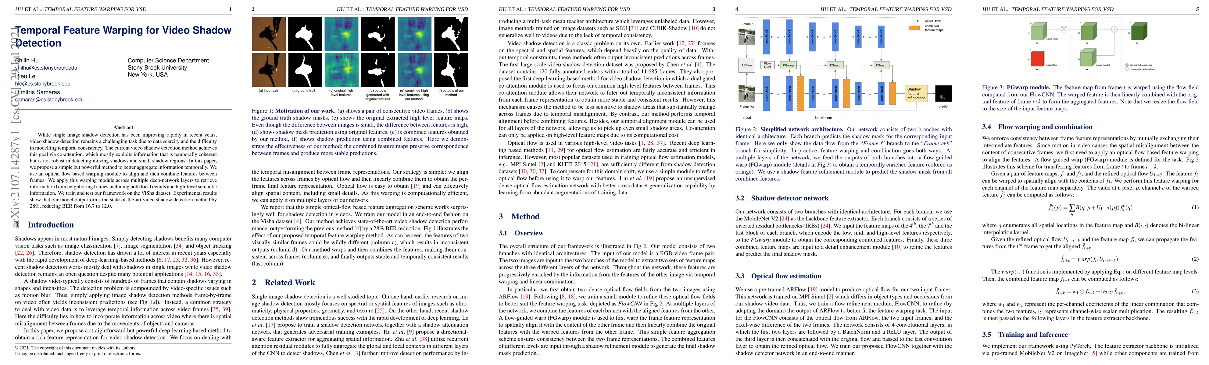 The paper proposes a video shadow detection method using an optical flow-based warping module to align and combine features across frames, applied at multiple deep-network layers for retrieving information from neighboring frames, including local details and high-level semantic information.