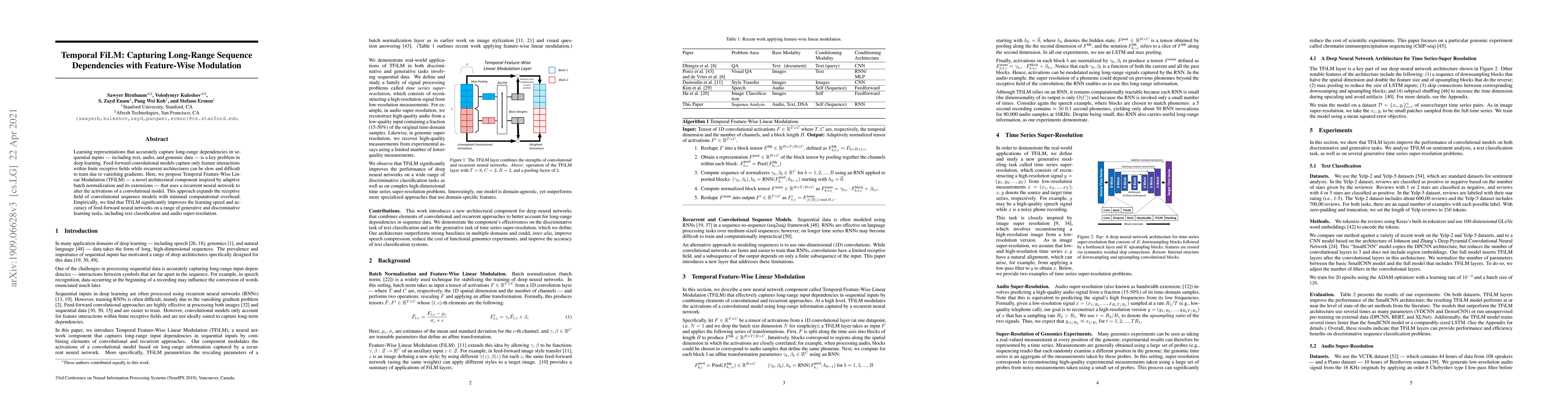 Learning representations that accurately capture long-range dependencies in sequential inputs -- including text, audio, and genomic data -- is a key problem in deep learning. Feed-forward convolutional models capture only feature interactions within finite receptive fields while recurrent architectures can be slow and difficult to train due to vanishing gradients. Here, we propose Temporal Feature-Wise Linear Modulation (TFiLM) -- a novel architectural component inspired by adaptive batch normalization and its extensions -- that uses a recurrent neural network to alter the activations of a convolutional model. This approach expands the receptive field of convolutional sequence models with minimal computational overhead. Empirically, we find that TFiLM significantly improves the learning speed and accuracy of feed-forward neural networks on a range of generative and discriminative learning tasks, including text classification and audio super-resolution