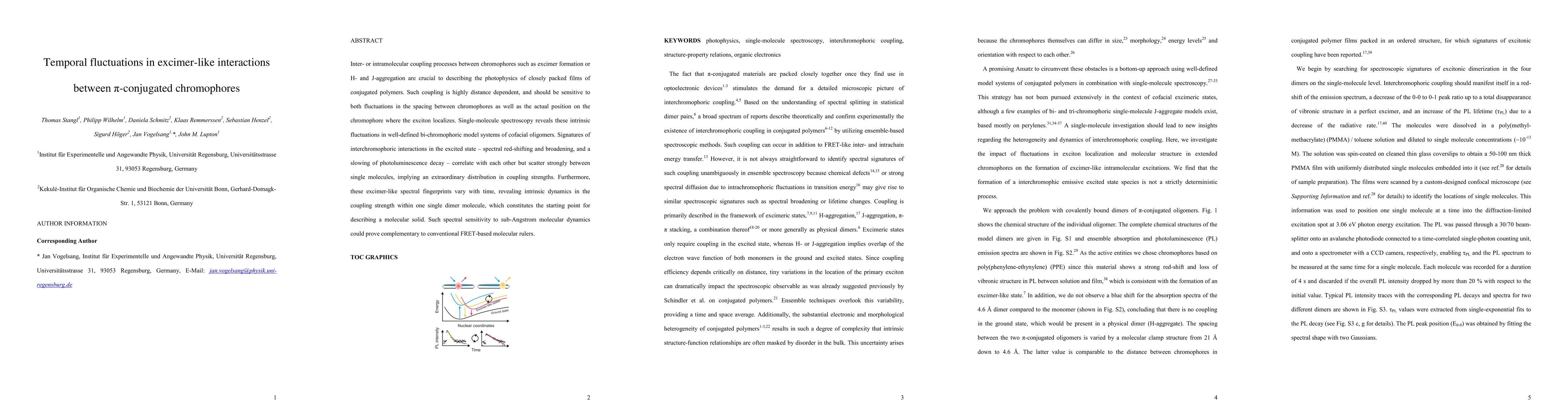 This paper investigates temporal fluctuations in excimer-like interactions between pi-conjugated chromophores using single-molecule spectroscopy. It finds significant variability in coupling strength and dynamics within bi-chromophoric model systems, suggesting potential for new insights into molecular solid photophysics.