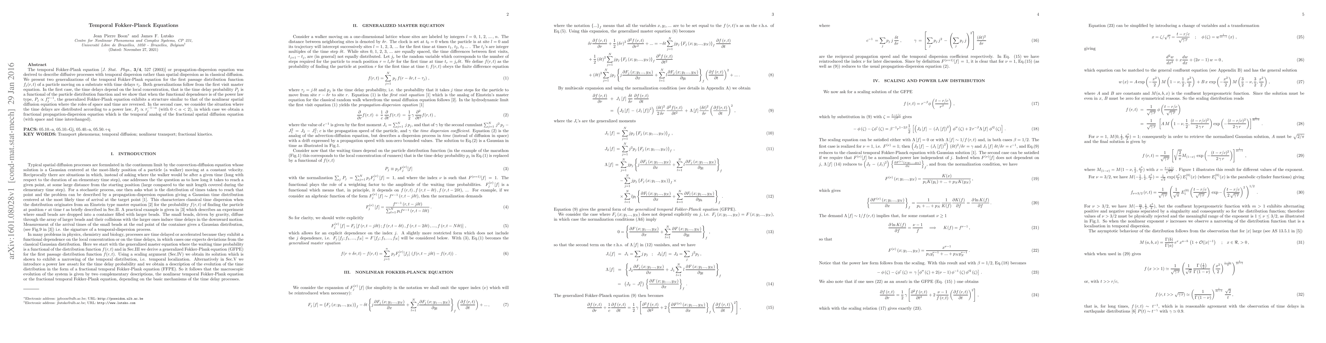The paper generalizes the temporal Fokker-Planck equation to describe diffusive processes with time delays, obtaining equations that exhibit non-linear behavior and fractional propagation-dispersion equations.