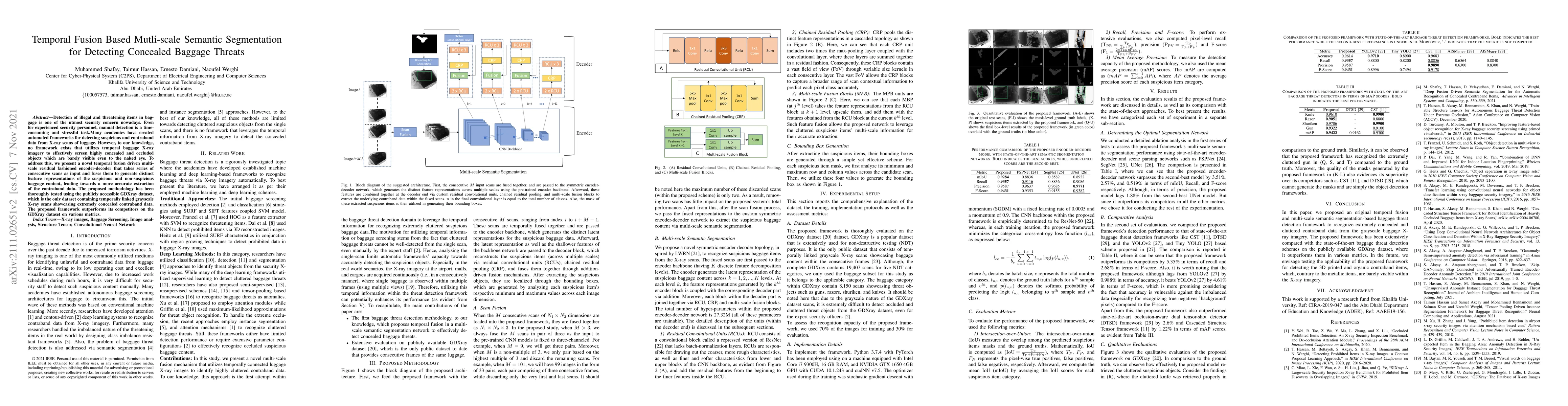 This paper introduces a temporal fusion-based multi-scale semantic segmentation framework to detect concealed threats in baggage using X-ray scans. The proposed method effectively screens highly concealed objects by fusing series of consecutive scans to generate distinct feature representations, outperforming existing frameworks on the GDXray dataset.