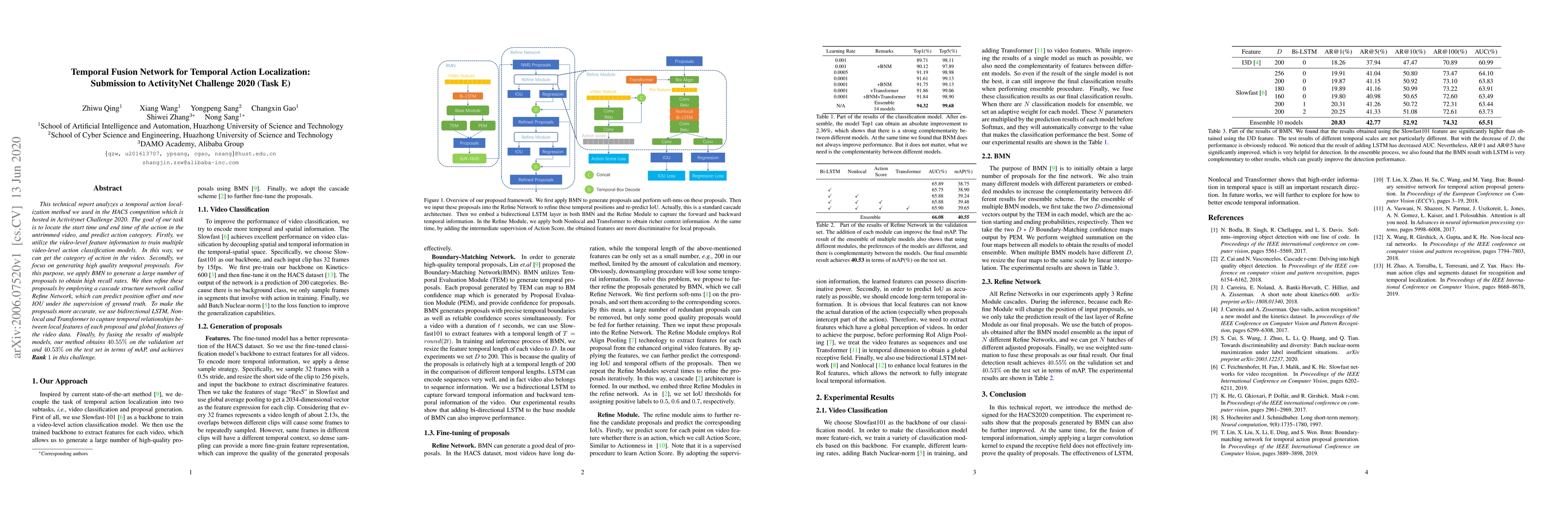 This paper presents a temporal fusion network for temporal action localization, achieving Rank 1 in the ActivityNet Challenge 2020. The method combines video-level classification, BMN-generated proposals, and a Refine Network to refine temporal proposals, utilizing bidirectional LSTM, Nonlocal, and Transformer layers to capture temporal relationships, ultimately achieving 40.55% mAP on the validation set.