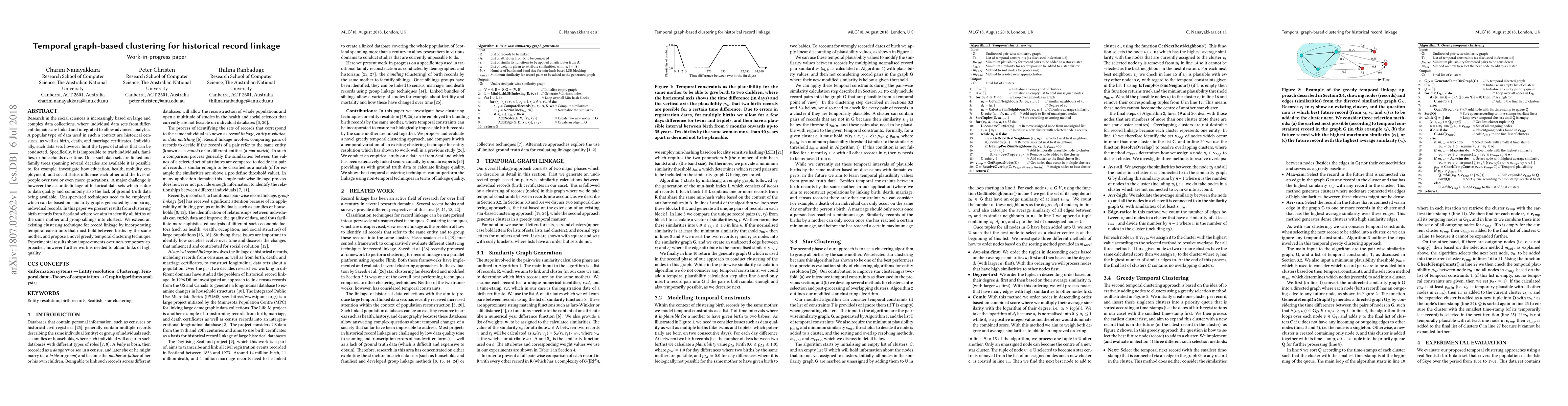 This paper introduces a novel temporal graph-based clustering technique for linking historical birth records, focusing on identifying siblings by the same mother. The proposed method incorporates temporal constraints and outperforms non-temporal approaches, though further refinement is required for higher linkage quality.