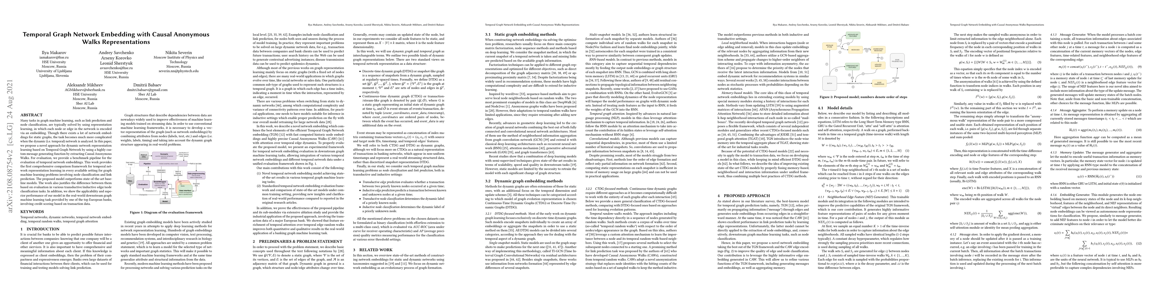 This paper proposes a novel method for temporal graph network embedding using Causal Anonymous Walks, significantly improving dynamic network representation learning for tasks like link prediction and node classification. The approach outperforms existing models and is validated through a comprehensive benchmark, demonstrating superior performance in real-world applications such as credit scoring.