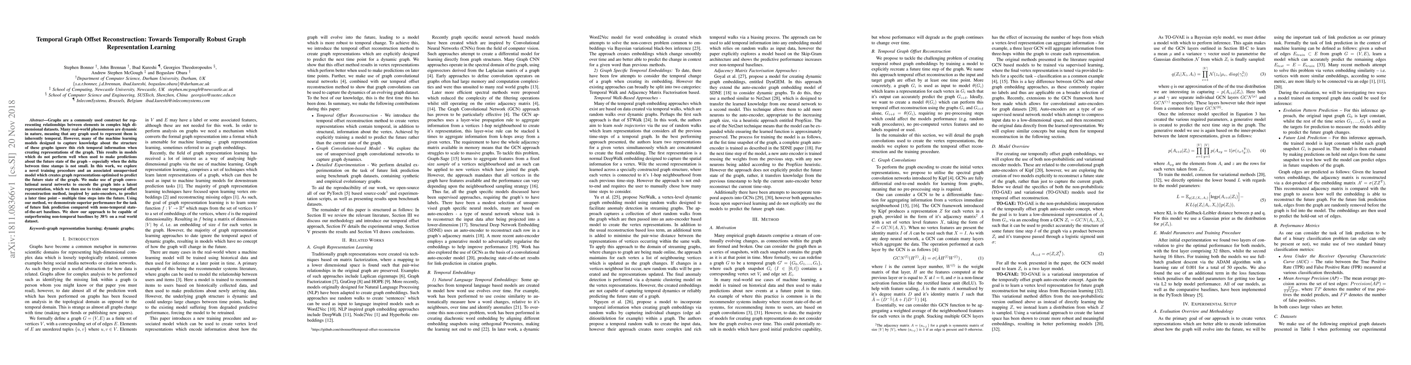 Graphs are a commonly used construct for representing relationships between elements in complex high dimensional datasets. Many real-world phenomenon are dynamic in nature, meaning that any graph used to represent them is inherently temporal. However, many of the machine learning models designed to capture knowledge about the structure of these graphs ignore this rich temporal information when creating representations of the graph. This results in models which do not perform well when used to make predictions about the future state of the graph -- especially when the delta between time stamps is not small. In this work, we explore a novel training procedure and an associated unsupervised model which creates graph representations optimised to predict the future state of the graph. We make use of graph convolutional neural networks to encode the graph into a latent representation, which we then use to train our temporal offset reconstruction method, inspired by auto-encoders, to predict a later time point -- multiple time steps into the future. Using our method, we demonstrate superior performance for the task of future link prediction compared with none-temporal state-of-the-art baselines. We show our approach to be capable of outperforming non-temporal baselines by 38% on a real world dataset.