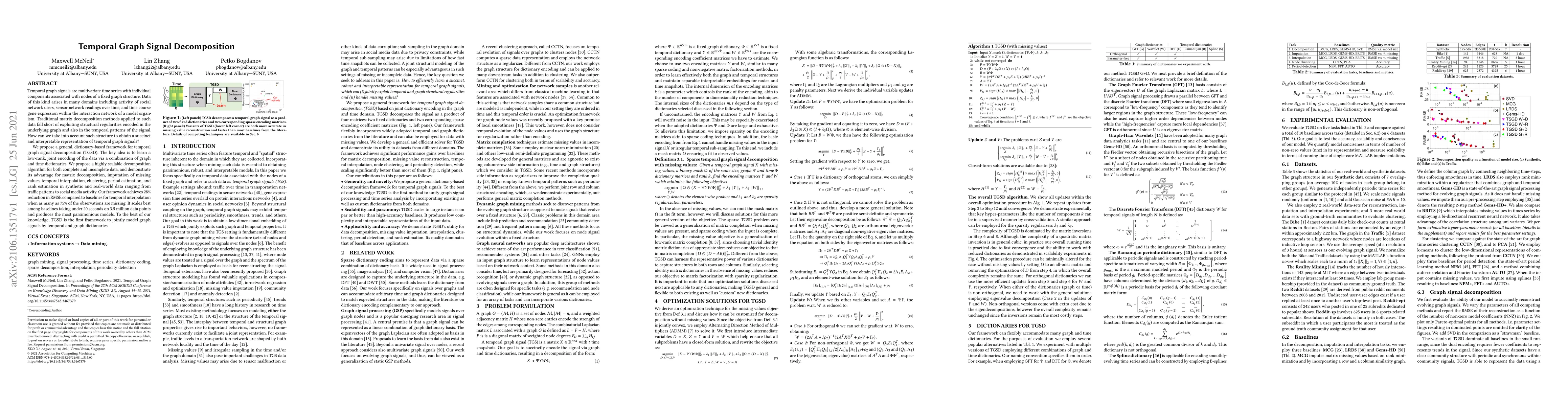 This paper proposes a framework for decomposing temporal graph signals into a joint encoding of data via graph and time dictionaries, achieving accurate representations with reduced RMSE in various applications.