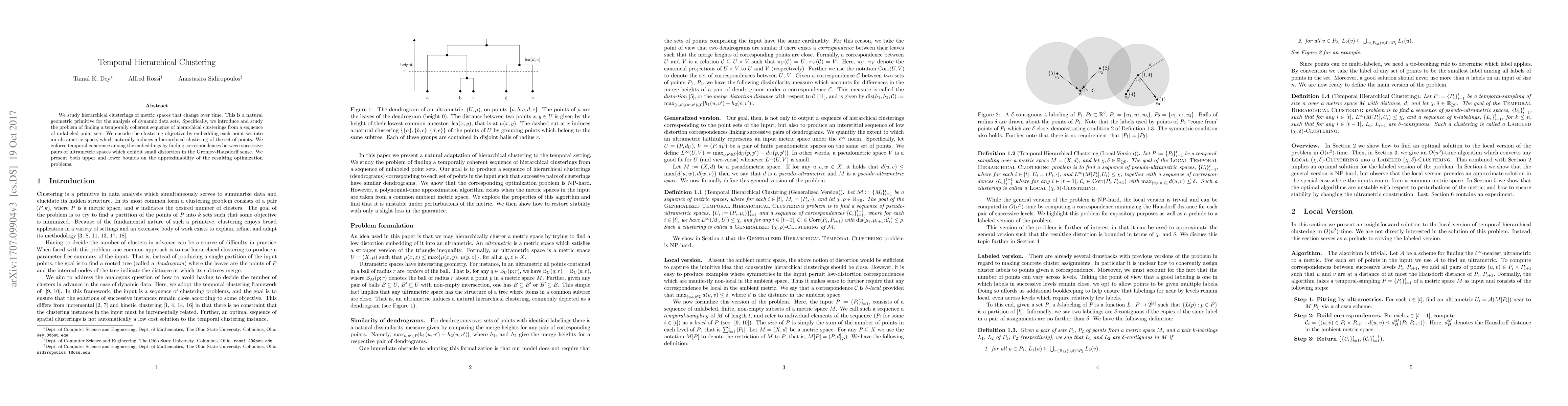 We study hierarchical clusterings of metric spaces that change over time. This is a natural geometric primitive for the analysis of dynamic data sets. Specifically, we introduce and study the problem of finding a temporally coherent sequence of hierarchical clusterings from a sequence of unlabeled point sets. We encode the clustering objective by embedding each point set into an ultrametric space, which naturally induces a hierarchical clustering of the set of points. We enforce temporal coherence among the embeddings by finding correspondences between successive pairs of ultrametric spaces which exhibit small distortion in the Gromov-Hausdorff sense. We present both upper and lower bounds on the approximability of the resulting optimization problems.