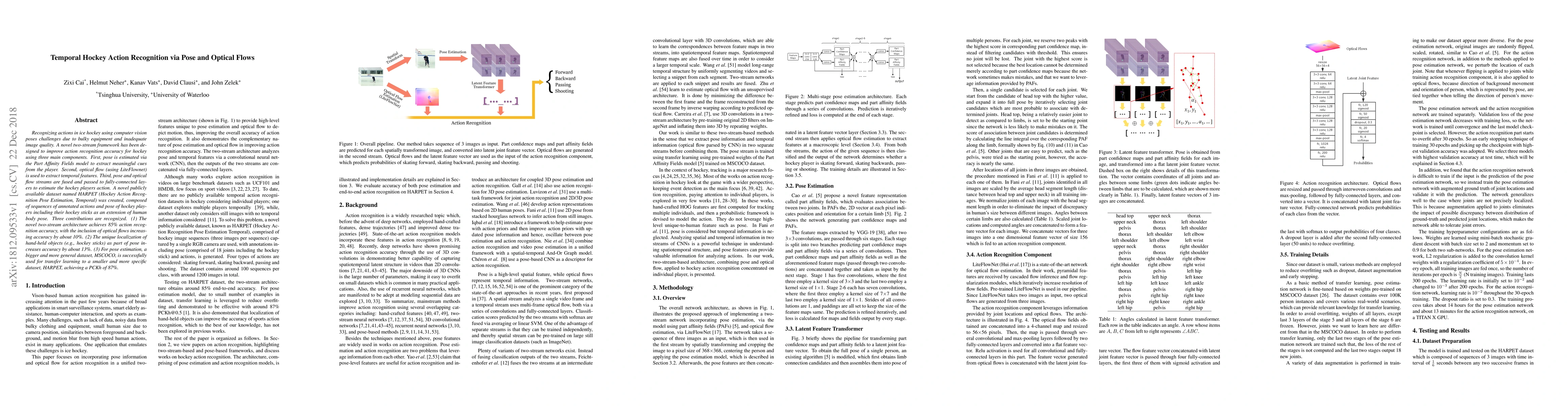 This paper proposes a two-stream framework for temporal hockey action recognition using pose estimation and optical flow, achieving 85% accuracy. The inclusion of optical flows enhances accuracy by 10%, and localization of hockey sticks as part of pose boosts it further by 13%.