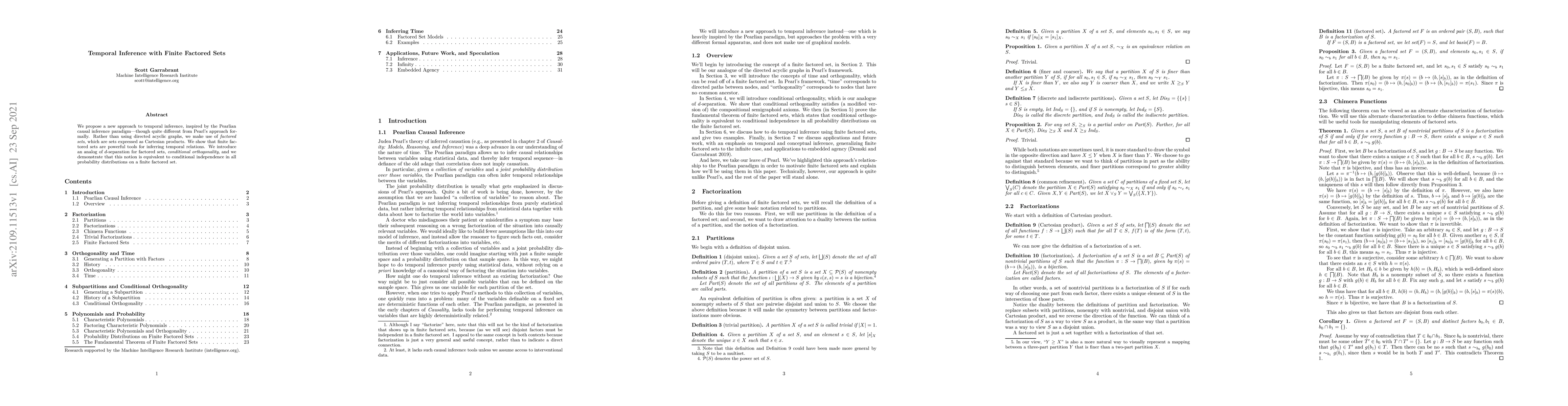 We propose a new approach to temporal inference, inspired by the Pearlian causal inference paradigm - though quite different from Pearl's approach formally. Rather than using directed acyclic graphs, we make use of factored sets, which are sets expressed as Cartesian products. We show that finite factored sets are powerful tools for inferring temporal relations. We introduce an analog of d-separation for factored sets, conditional orthogonality, and we demonstrate that this notion is equivalent to conditional independence in all probability distributions on a finite factored set.
