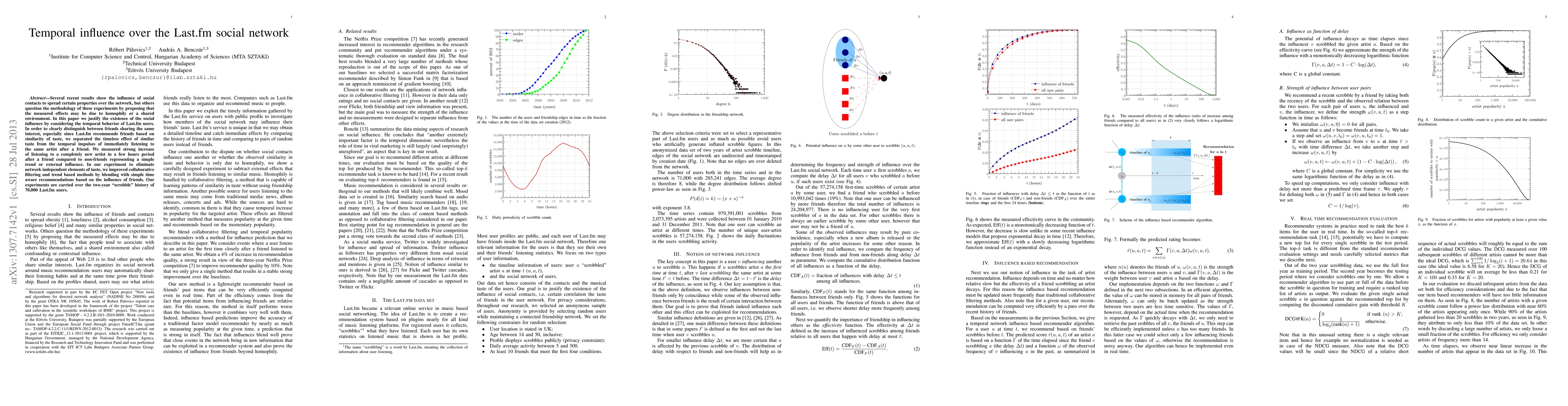 Several recent results show the influence of social contacts to spread certain properties over the network, but others question the methodology of these experiments by proposing that the measured effects may be due to homophily or a shared environment. In this paper we justify the existence of the social influence by considering the temporal behavior of Last.fm users. In order to clearly distinguish between friends sharing the same interest, especially since Last.fm recommends friends based on similarity of taste, we separated the timeless effect of similar taste from the temporal impulses of immediately listening to the same artist after a friend. We measured strong increase of listening to a completely new artist in a few hours period after a friend compared to non-friends representing a simple trend or external influence. In our experiment to eliminate network independent elements of taste, we improved collaborative filtering and trend based methods by blending with simple time aware recommendations based on the influence of friends. Our experiments are carried over the two-year "scrobble" history of 70,000 Last.fm users.