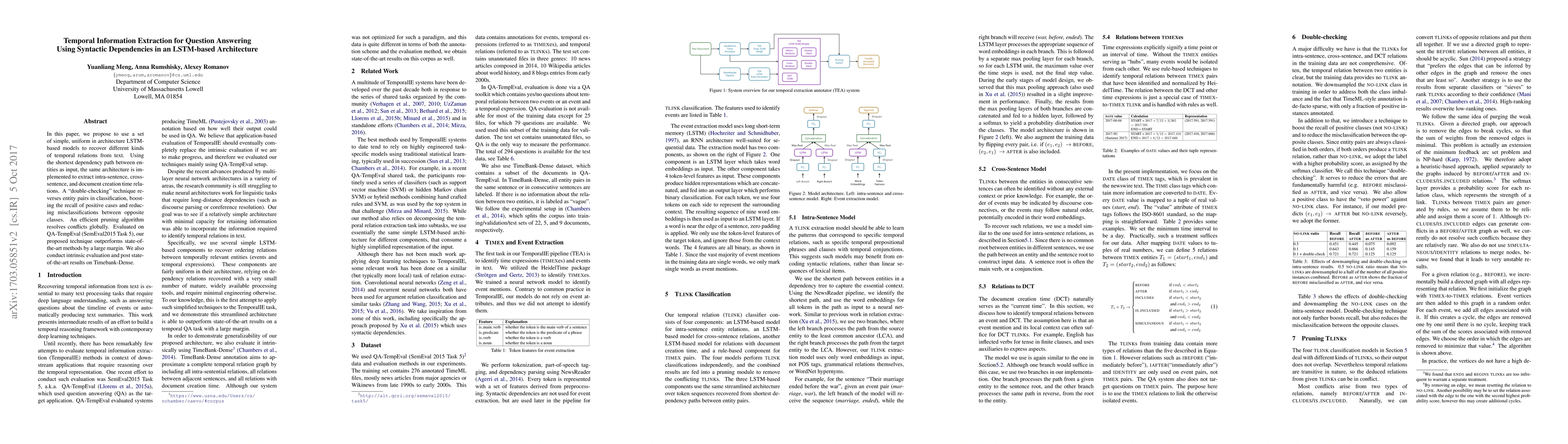 In this paper, we propose to use a set of simple, uniform in architecture LSTM-based models to recover different kinds of temporal relations from text. Using the shortest dependency path between entities as input, the same architecture is used to extract intra-sentence, cross-sentence, and document creation time relations. A "double-checking" technique reverses entity pairs in classification, boosting the recall of positive cases and reducing misclassifications between opposite classes. An efficient pruning algorithm resolves conflicts globally. Evaluated on QA-TempEval (SemEval2015 Task 5), our proposed technique outperforms state-of-the-art methods by a large margin.