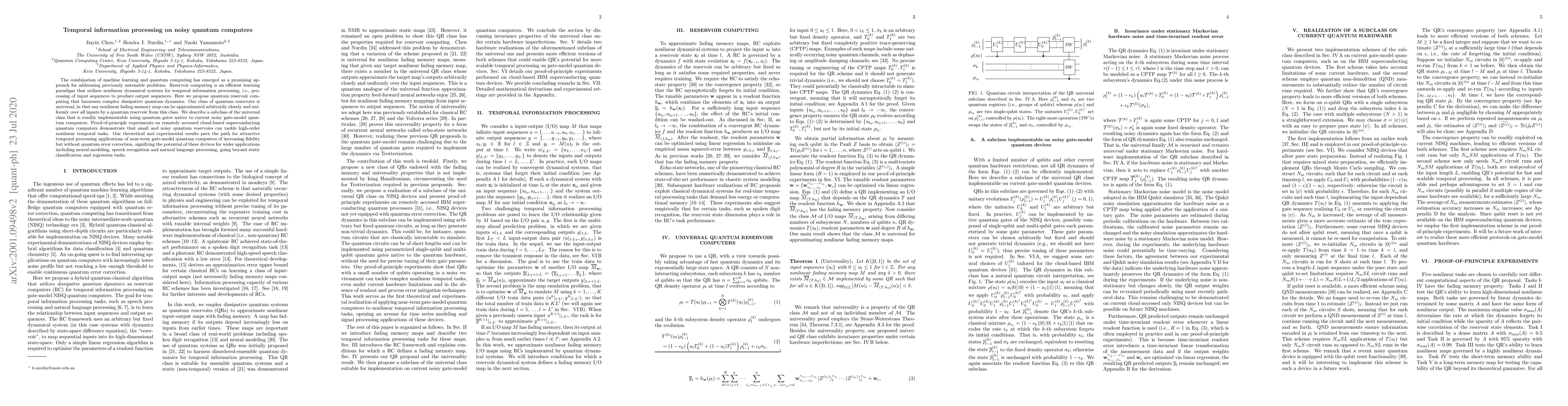 The combination of machine learning and quantum computing has emerged as a promising approach for addressing previously untenable problems. Reservoir computing is an efficient learning paradigm that utilizes nonlinear dynamical systems for temporal information processing, i.e., processing of input sequences to produce output sequences. Here we propose quantum reservoir computing that harnesses complex dissipative quantum dynamics. Our class of quantum reservoirs is universal, in that any nonlinear fading memory map can be approximated arbitrarily closely and uniformly over all inputs by a quantum reservoir from this class. We describe a subclass of the universal class that is readily implementable using quantum gates native to current noisy gate-model quantum computers. Proof-of-principle experiments on remotely accessed cloud-based superconducting quantum computers demonstrate that small and noisy quantum reservoirs can tackle high-order nonlinear temporal tasks. Our theoretical and experimental results pave the path for attractive temporal processing applications of near-term gate-model quantum computers of increasing fidelity but without quantum error correction, signifying the potential of these devices for wider applications including neural modeling, speech recognition and natural language processing, going beyond static classification and regression tasks.