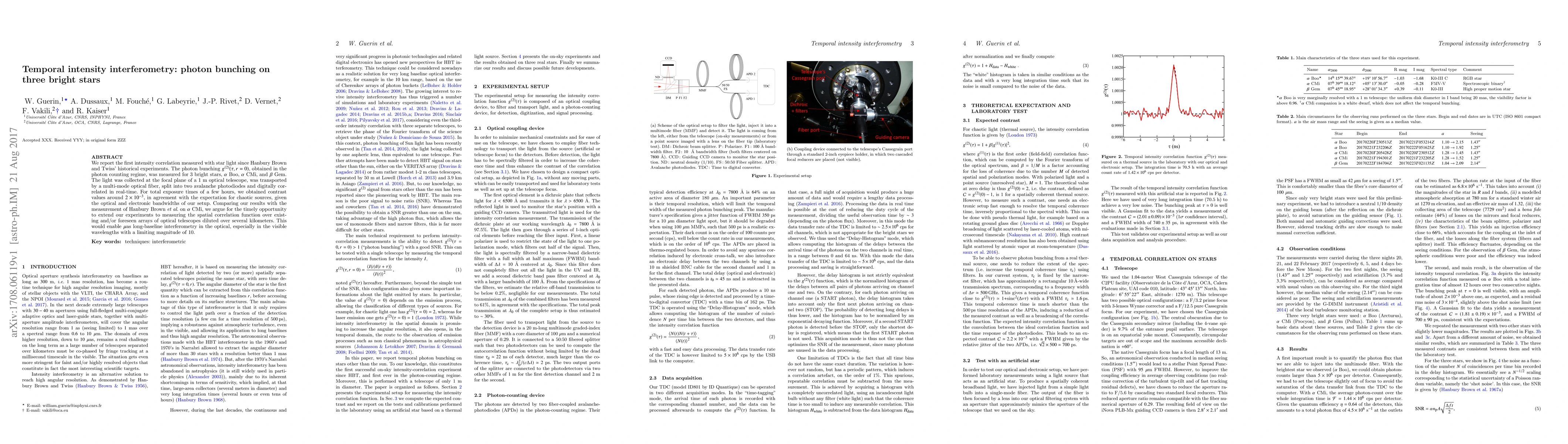 Researchers measured photon bunching on three bright stars using a 1m optical telescope and multi-mode fiber, achieving contrast values of $2 imes10^{-3}$ for total exposure times of several hours.