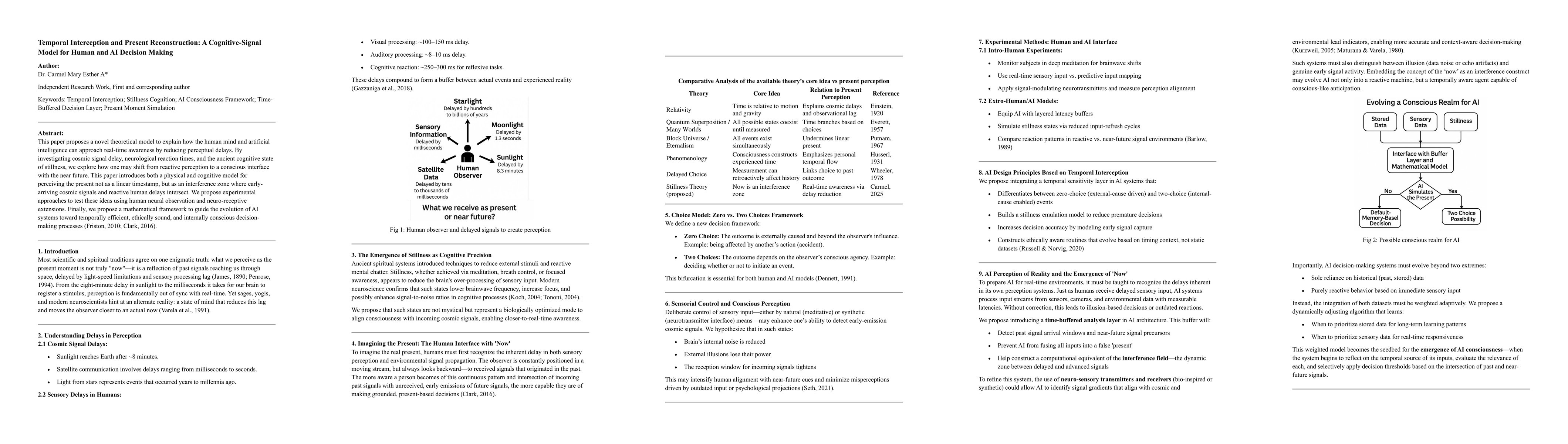 The paper presents a cognitive-signal model that merges physical and cognitive aspects to explain temporal interception and present reconstruction in humans and AI.