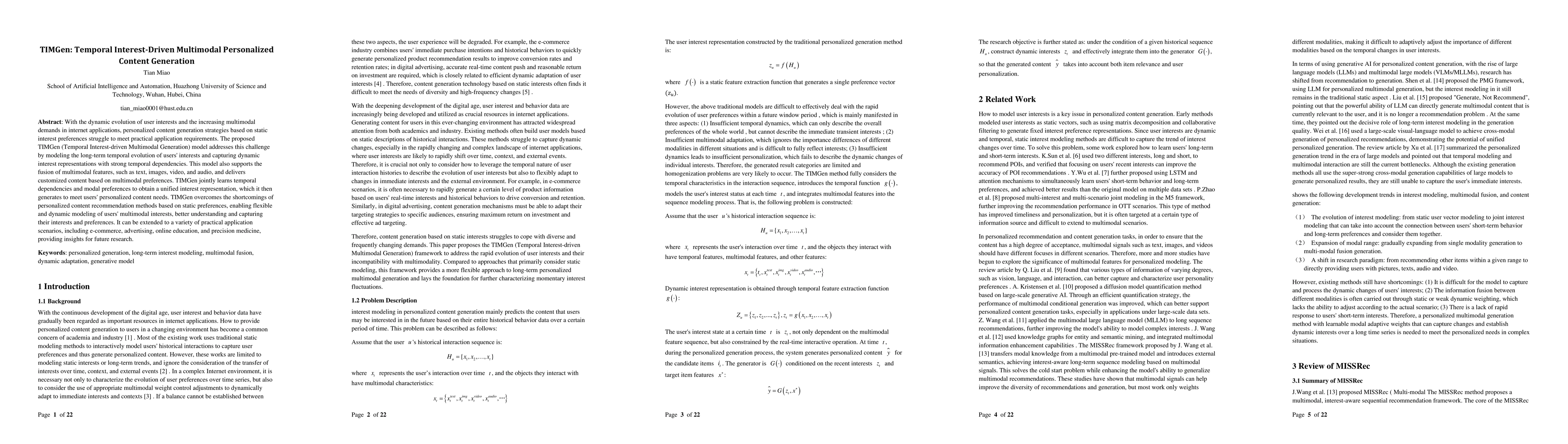 With the dynamic evolution of user interests and the increasing multimodal demands in internet applications, personalized content generation strategies based on static interest preferences struggle to meet practical application requirements. The proposed TIMGen (Temporal Interest-driven Multimodal Generation) model addresses this challenge by modeling the long-term temporal evolution of users' interests and capturing dynamic interest representations with strong temporal dependencies. This model also supports the fusion of multimodal features, such as text, images, video, and audio, and delivers customized content based on multimodal preferences. TIMGen jointly learns temporal dependencies and modal preferences to obtain a unified interest representation, which it then generates to meet users' personalized content needs. TIMGen overcomes the shortcomings of personalized content recommendation methods based on static preferences, enabling flexible and dynamic modeling of users' multimodal interests, better understanding and capturing their interests and preferences. It can be extended to a variety of practical application scenarios, including e-commerce, advertising, online education, and precision medicine, providing insights for future research.