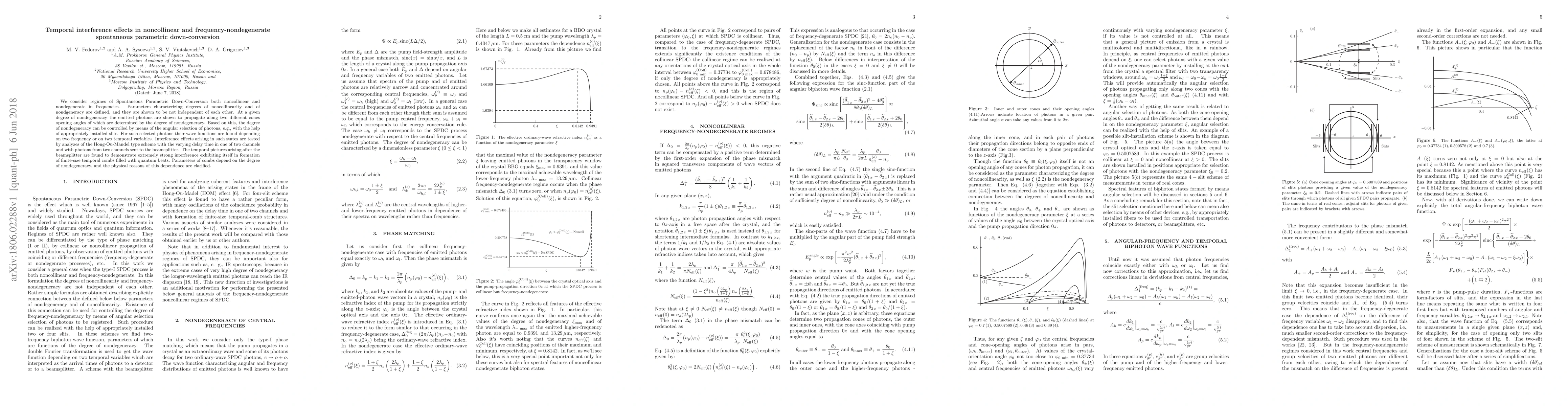 We consider regimes of Spontaneous Parametric Down-Conversion both noncollinear and nondegenerate in frequencies. Parameters characterizing degrees of noncollinearity and of nondgeneracy are defined, and they are shown to be not independent of each other. At a given degree of nondegeneracy the emitted photons are shown to propagate along two different cones opening angles of which are determined by the degree of nondegeneracy. Based on this, the degree of nondegeneracy can be controlled by means of the angular selection of photons, e.g., with the help of appropriately installed slits. For such selected photons their wave functions are found depending on two frequency or on two temporal variables. Interference effects arising in such states are tested by analyzes of the Hong-Ou-Mandel type scheme with the varying delay time in one of two channels and with photons from two channels sent to the beamsplitter. The temporal pictures arising after the beamsplitter are found to demonstrate extremely strong interference exhibiting itself in formation of finite-size temporal combs filled with quantum beats. Parameters of combs depend on the degree of nondegeneracy, and the physical reasons of this dependence are clarified.