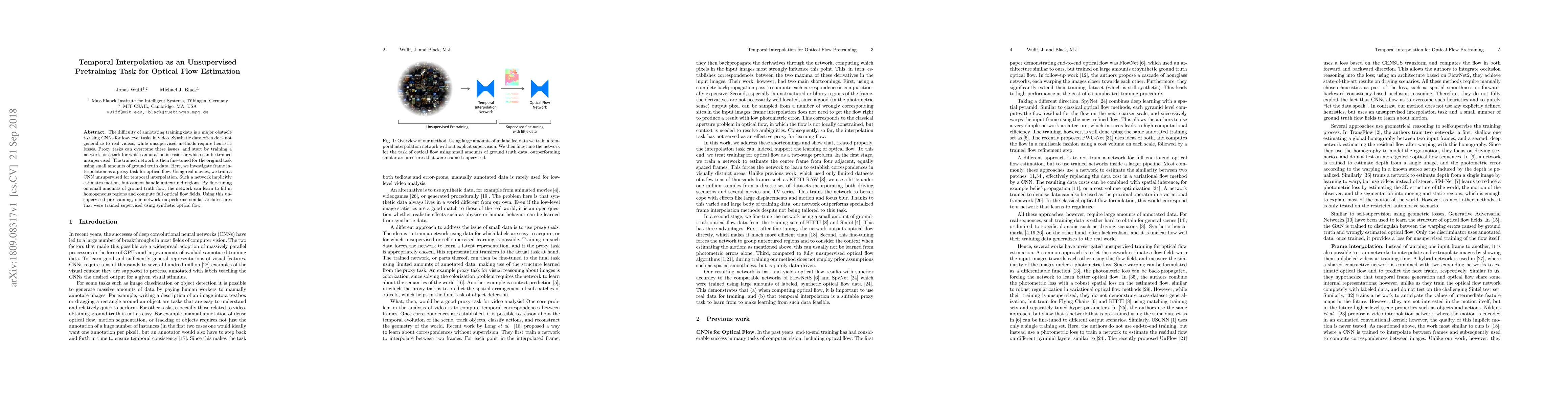 This paper explores using temporal interpolation as an unsupervised pretraining method to improve optical flow estimation. An unsupervised CNN trained on frame interpolation tasks implicitly learns motion, which is then fine-tuned with minimal ground truth data to handle untextured regions, outperforming supervised methods reliant on synthetic data.
