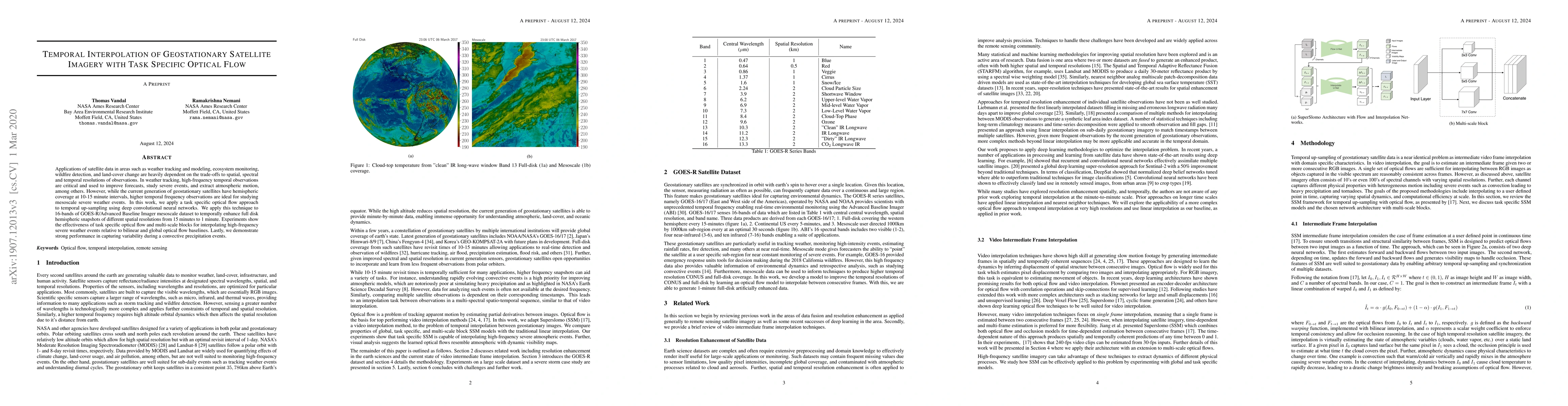 This paper proposes a deep convolutional neural network with task-specific optical flow to enhance the temporal resolution of geostationary satellite imagery from 15 minutes to 1 minute. The method is shown to effectively capture high-frequency severe weather events and variability during convective precipitation events compared to traditional interpolation methods.