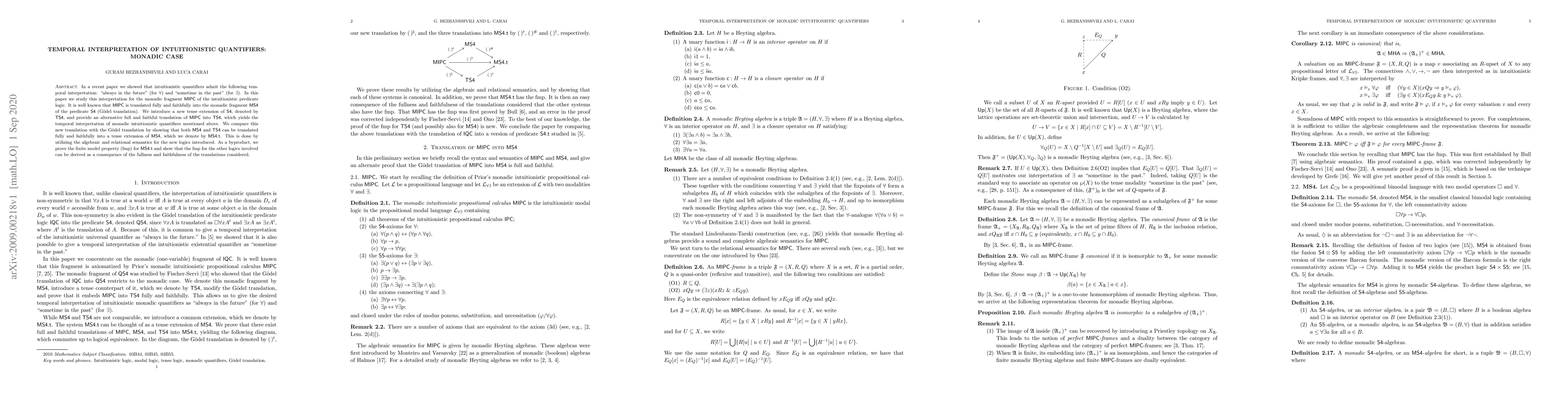 In a recent paper we showed that intuitionistic quantifiers admit the following temporal interpretation: "always in the future" (for $\forall$) and "sometime in the past" (for $\exists$). In this paper we study this interpretation for the monadic fragment $\sf MIPC$ of the intuitionistic predicate logic. It is well known that $\sf MIPC$ is translated fully and faithfully into the monadic fragment $\sf MS4$ of the predicate $\sf S4$ (G\"{o}del translation). We introduce a new tense extension of $\sf S4$, denoted by $\sf TS4$, and provide an alternative full and faithful translation of $\sf MIPC$ into $\sf TS4$, which yields the temporal interpretation of monadic intuitionistic quantifiers mentioned above. We compare this new translation with the G\"{o}del translation by showing that both $\sf MS4$ and $\sf TS4$ can be translated fully and faithfully into a tense extension of $\sf MS4$, which we denote by $\sf MS4.t$. This is done by utilizing the algebraic and relational semantics for the new logics introduced. As a byproduct, we prove the finite model property (fmp) for $\sf MS4.t$ and show that the fmp for the other logics involved can be derived as a consequence of the fullness and faithfulness of the translations considered.