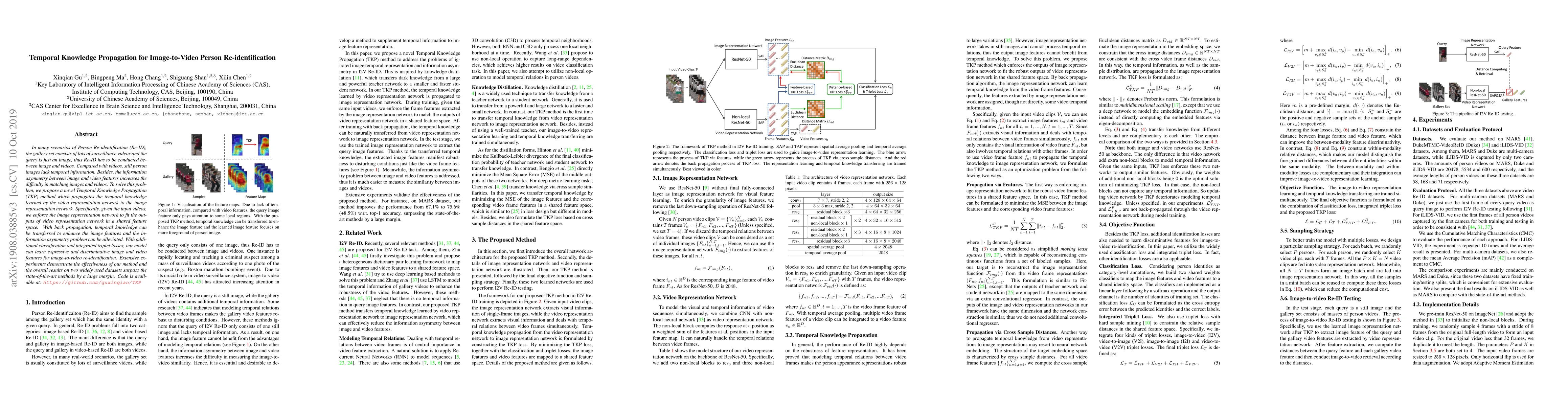 This paper proposes a Temporal Knowledge Propagation (TKP) method to enhance image-to-video person re-identification by transferring temporal knowledge from video to image representations, reducing information asymmetry and improving feature expressiveness. Experimental results show significant performance gains over state-of-the-art methods on two datasets.