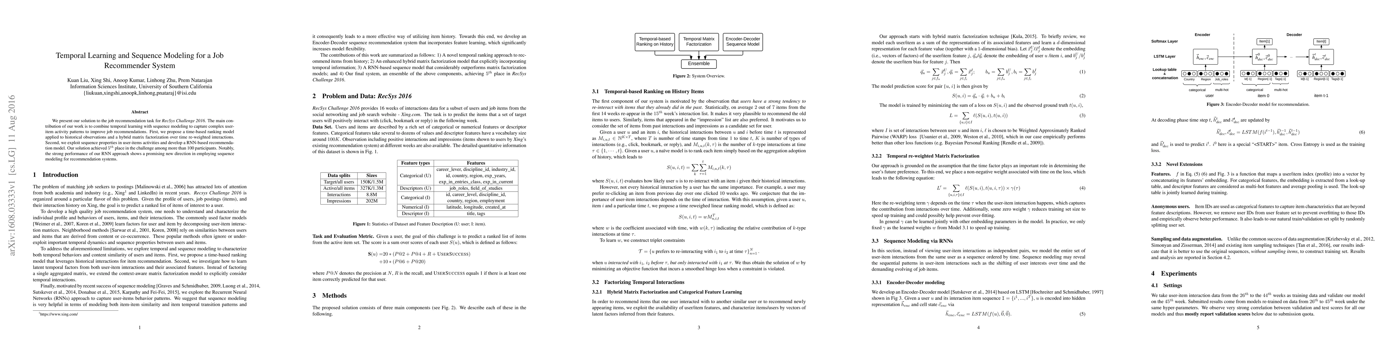 We present our solution to the job recommendation task for RecSys Challenge 2016. The main contribution of our work is to combine temporal learning with sequence modeling to capture complex user-item activity patterns to improve job recommendations. First, we propose a time-based ranking model applied to historical observations and a hybrid matrix factorization over time re-weighted interactions. Second, we exploit sequence properties in user-items activities and develop a RNN-based recommendation model. Our solution achieved 5$^{th}$ place in the challenge among more than 100 participants. Notably, the strong performance of our RNN approach shows a promising new direction in employing sequence modeling for recommendation systems.