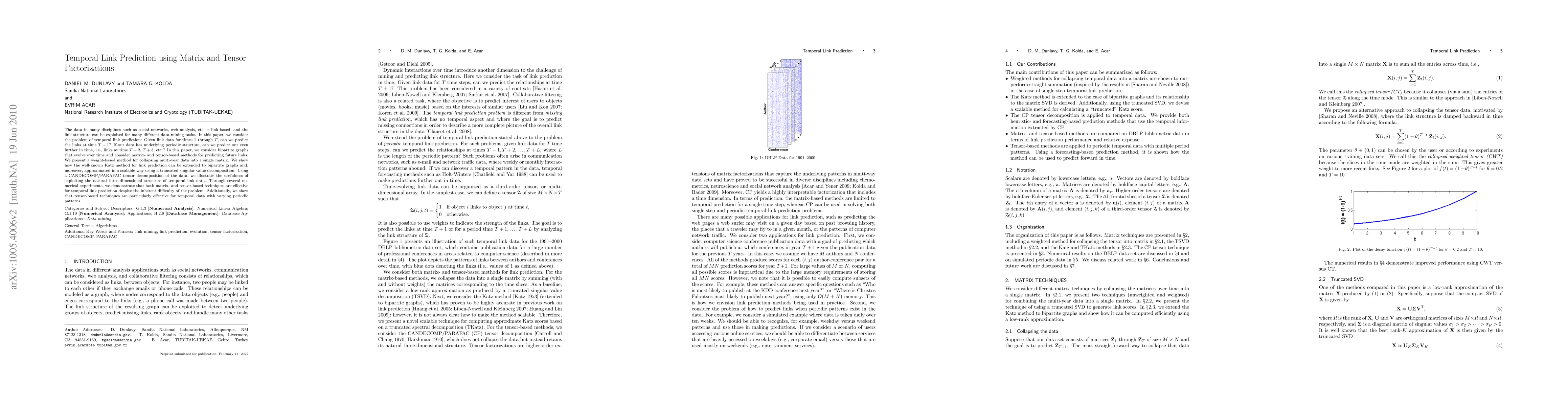 This paper explores temporal link prediction in evolving bipartite graphs using matrix and tensor factorizations. It proposes methods for predicting future links and demonstrates the effectiveness of both techniques through numerical experiments, highlighting the advantages of tensor-based approaches for data with periodic patterns.