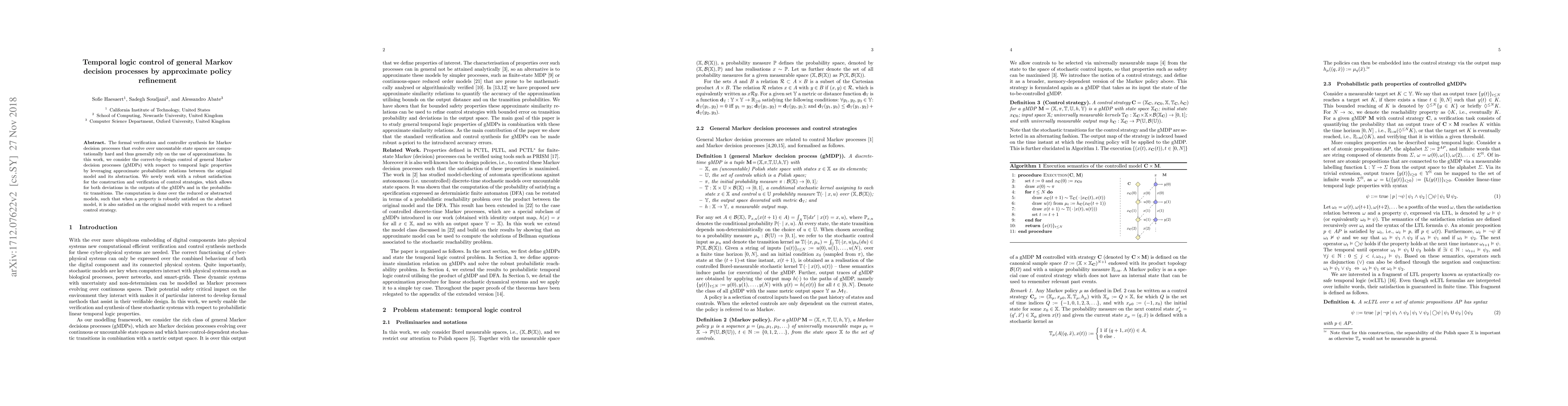 This paper proposes a method for controlling general Markov decision processes (gMDPs) with respect to temporal logic properties using approximate policy refinement. It leverages probabilistic relations between the original and abstract models to ensure robust satisfaction of properties, allowing for deviations in both outputs and transitions.