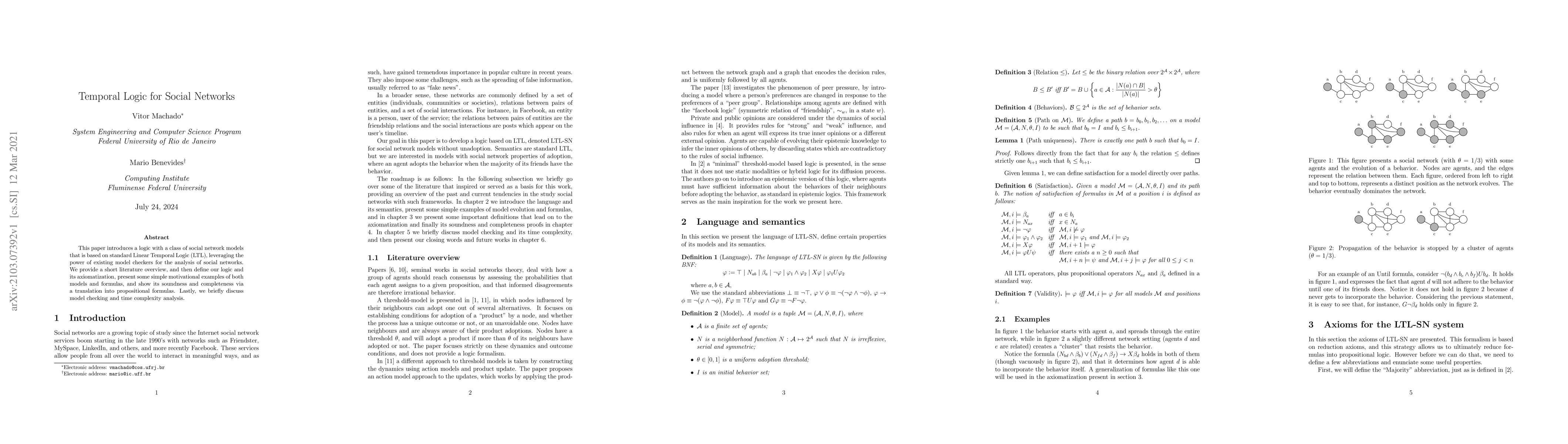 This paper proposes a new logic based on Linear Temporal Logic (LTL) for analyzing social network models, leveraging existing model checkers. It defines the logic, demonstrates its soundness and completeness, and briefly discusses model checking and time complexity.
