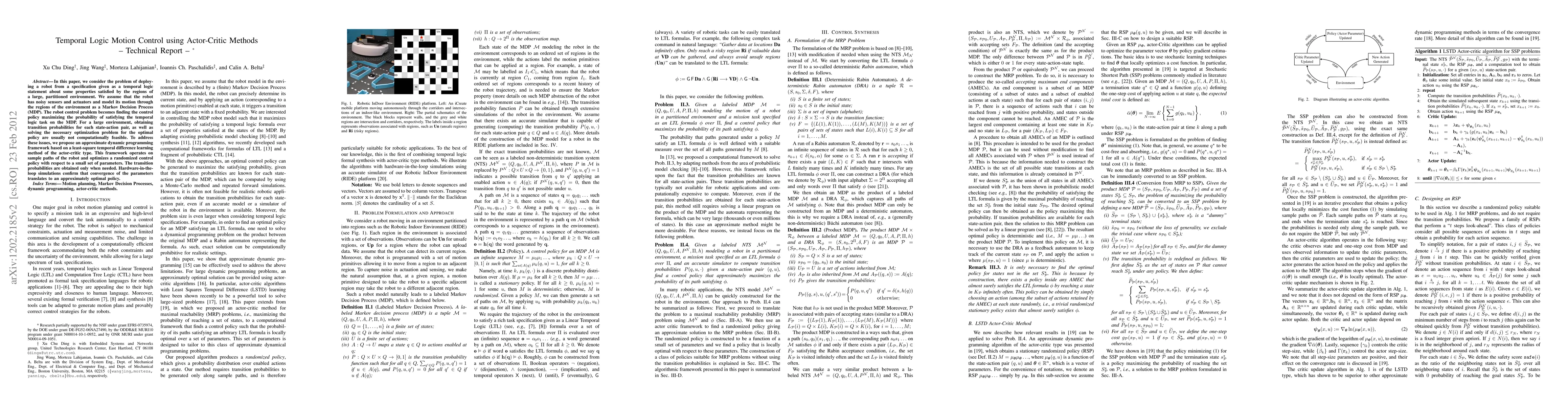 In this paper, we consider the problem of deploying a robot from a specification given as a temporal logic statement about some properties satisfied by the regions of a large, partitioned environment. We assume that the robot has noisy sensors and actuators and model its motion through the regions of the environment as a Markov Decision Process (MDP). The robot control problem becomes finding the control policy maximizing the probability of satisfying the temporal logic task on the MDP. For a large environment, obtaining transition probabilities for each state-action pair, as well as solving the necessary optimization problem for the optimal policy are usually not computationally feasible. To address these issues, we propose an approximate dynamic programming framework based on a least-square temporal difference learning method of the actor-critic type. This framework operates on sample paths of the robot and optimizes a randomized control policy with respect to a small set of parameters. The transition probabilities are obtained only when needed. Hardware-in-the-loop simulations confirm that convergence of the parameters translates to an approximately optimal policy.