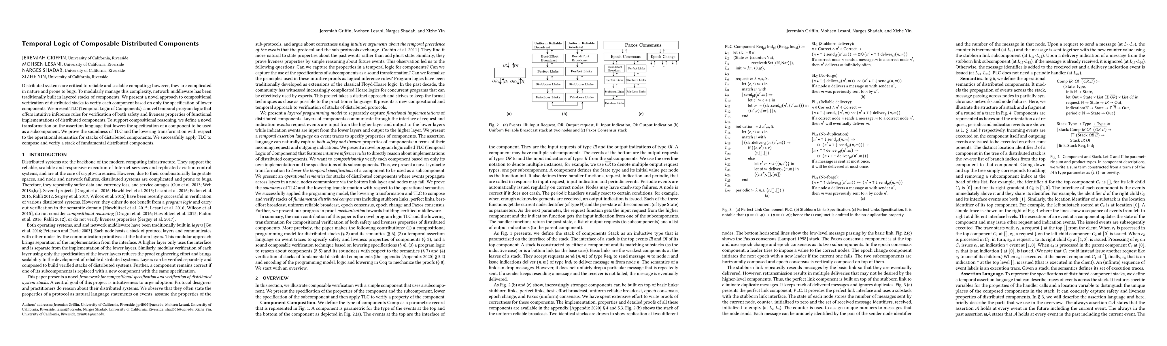 Distributed systems are critical to reliable and scalable computing; however, they are complicated in nature and prone to bugs. To modularly manage this complexity, network middleware has been traditionally built in layered stacks of components. We present a novel approach to compositional verification of distributed stacks to verify each component based on only the specification of lower components. We present TLC (Temporal Logic of Components), a novel temporal program logic that offers intuitive inference rules for verification of both safety and liveness properties of functional implementations of distributed components. To support compositional reasoning, we define a novel transformation on the assertion language that lowers the specification of a component to be used as a subcomponent. We prove the soundness of TLC and the lowering transformation with respect to the operational semantics for stacks of distributed components. We successfully apply TLC to compose and verify a stack of fundamental distributed components.