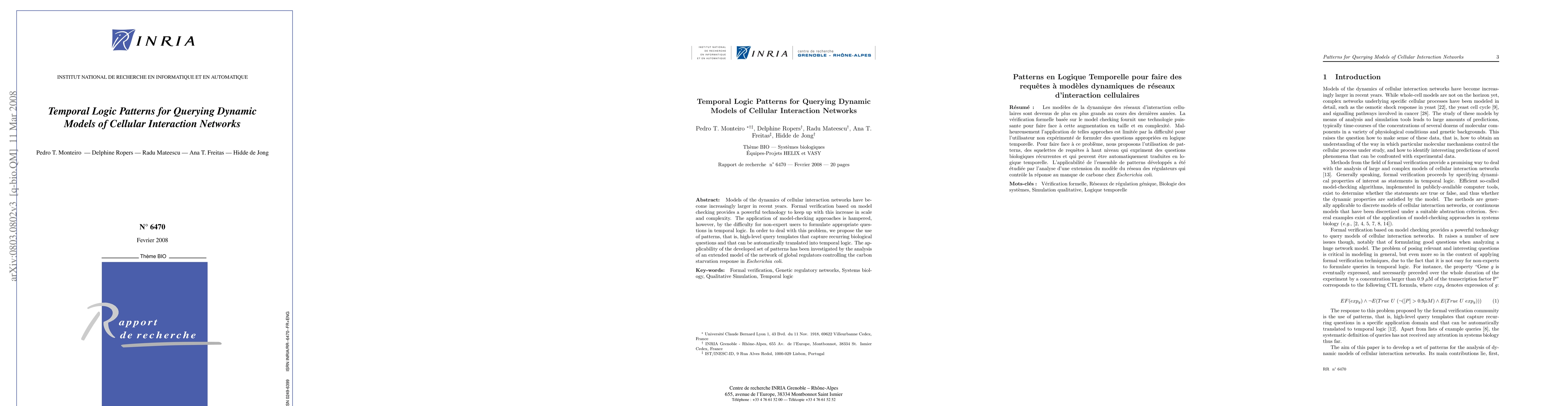 Models of the dynamics of cellular interaction networks have become increasingly larger in recent years. Formal verification based on model checking provides a powerful technology to keep up with this increase in scale and complexity. The application of model-checking approaches is hampered, however, by the difficulty for non-expert users to formulate appropriate questions in temporal logic. In order to deal with this problem, we propose the use of patterns, that is, high-level query templates that capture recurring biological questions and that can be automatically translated into temporal logic. The applicability of the developed set of patterns has been investigated by the analysis of an extended model of the network of global regulators controlling the carbon starvation response in Escherichia coli.
