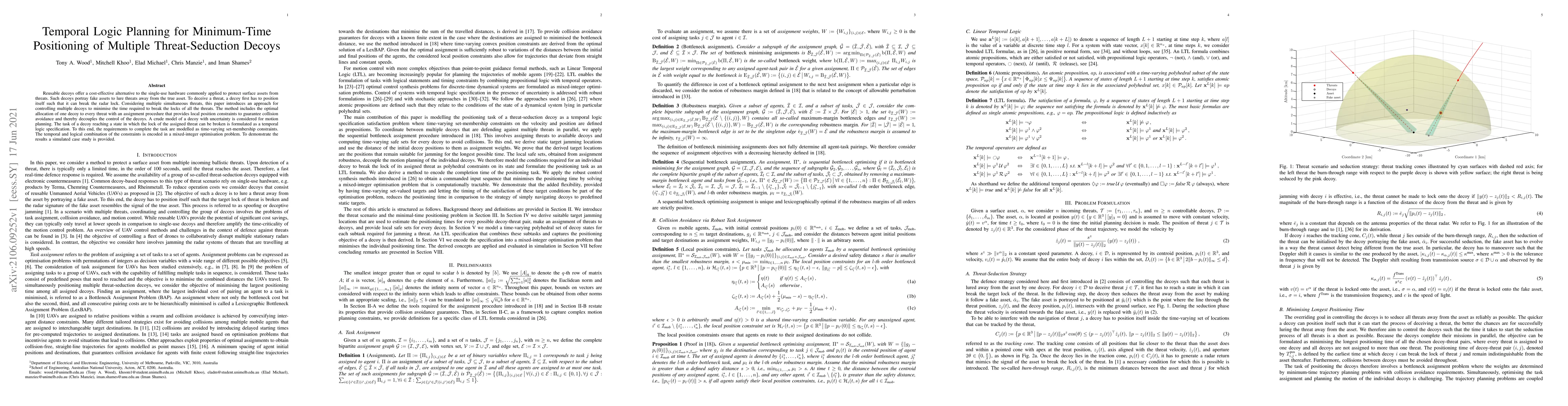 Reusable decoys offer a cost-effective alternative to the single-use hardware commonly applied to protect surface assets from threats. Such decoys portray fake assets to lure threats away from the true asset. To deceive a threat, a decoy first has to position itself such that it can break the radar lock. Considering multiple simultaneous threats, this paper introduces an approach for controlling multiple decoys to minimise the time required to break the locks of all the threats. The method includes the optimal allocation of one decoy to every threat with an assignment procedure that provides local position constraints to guarantee collision avoidance and thereby decouples the control of the decoys. A crude model of a decoy with uncertainty is considered for motion planning. The task of a decoy reaching a state in which the lock of the assigned threat can be broken is formulated as a temporal logic specification. To this end, the requirements to complete the task are modelled as time-varying set-membership constraints. The temporal and logical combination of the constraints is encoded in a mixed-integer optimisation problem. To demonstrate the results a simulated case study is provided.