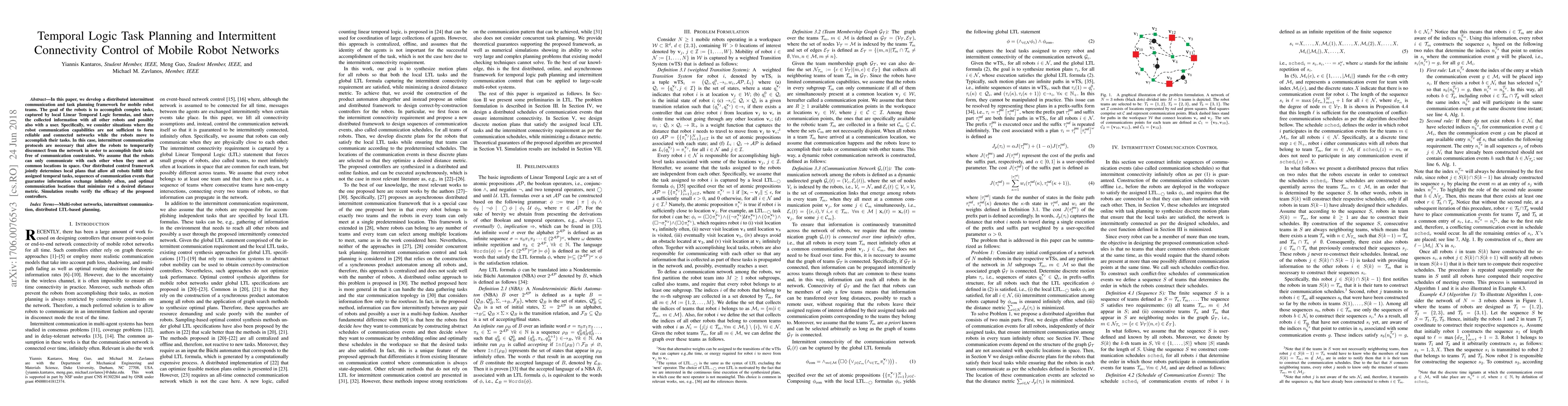 This paper proposes a distributed framework for mobile robot teams to accomplish complex tasks using Linear Temporal Logic, while managing intermittent connectivity through optimal communication protocols and locations. Simulation results demonstrate the effectiveness of the proposed approach.