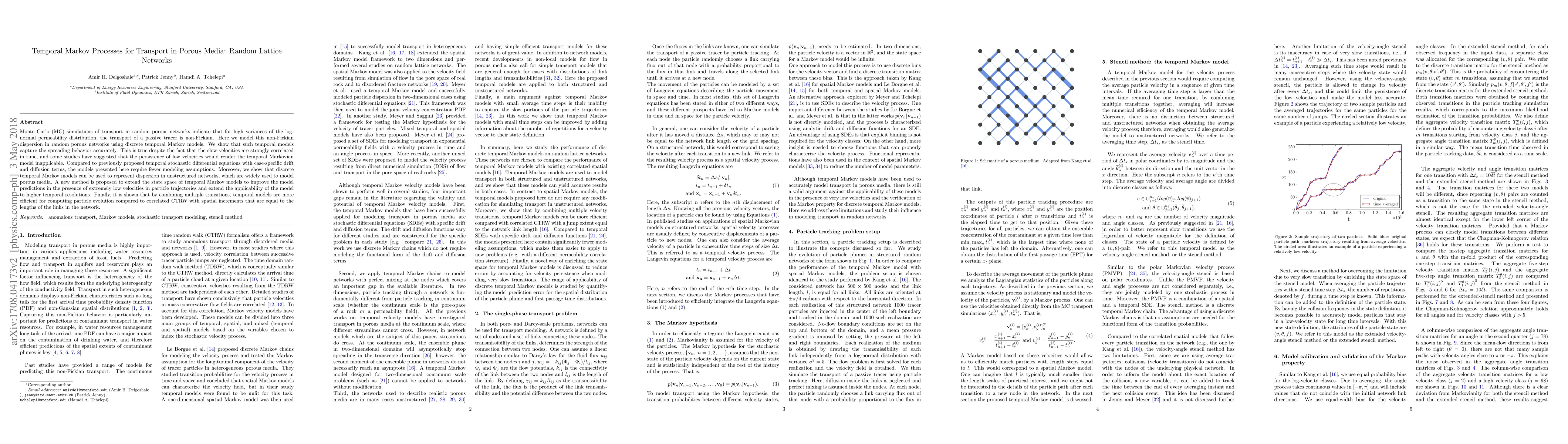 This paper models non-Fickian transport in random porous networks using discrete temporal Markov processes, demonstrating their accuracy in capturing spreading behavior despite strong temporal correlations in slow velocities. The proposed models require fewer assumptions than previous stochastic differential equations and can represent dispersion in unstructured networks.