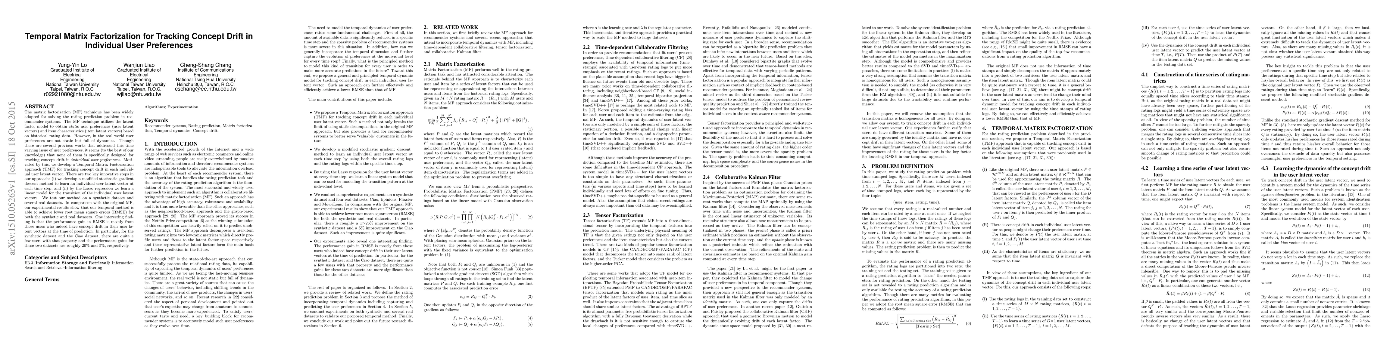 A new approach to tracking concept drift in individual user preferences is proposed through Temporal Matrix Factorization, achieving lower root mean square errors than original matrix factorization method.