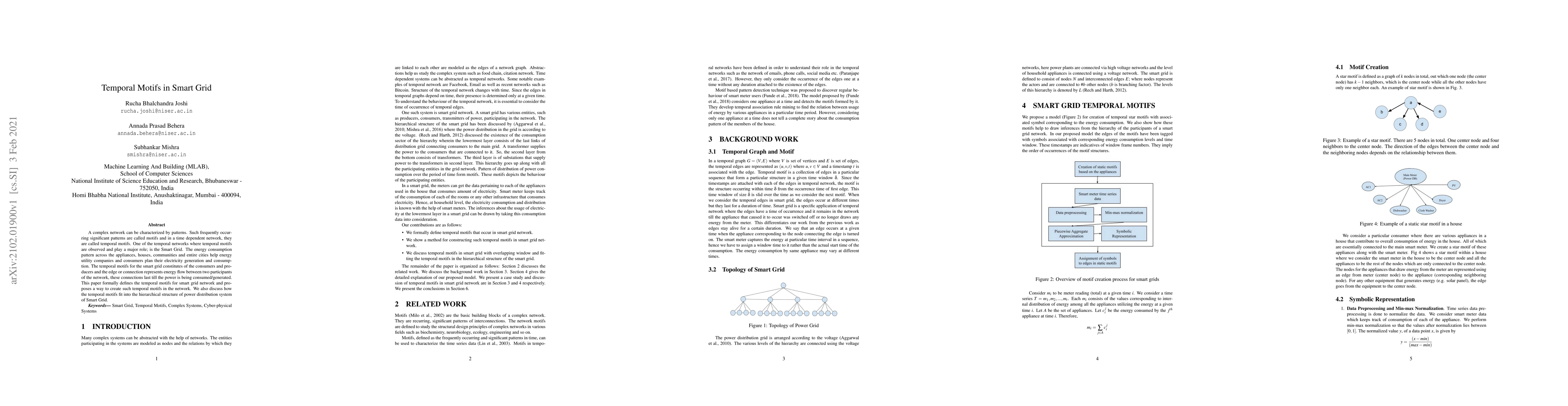 This paper defines temporal motifs in the smart grid network, which represent recurring patterns in energy consumption and generation. It proposes methods to create these motifs and discusses their integration into the hierarchical structure of power distribution systems.