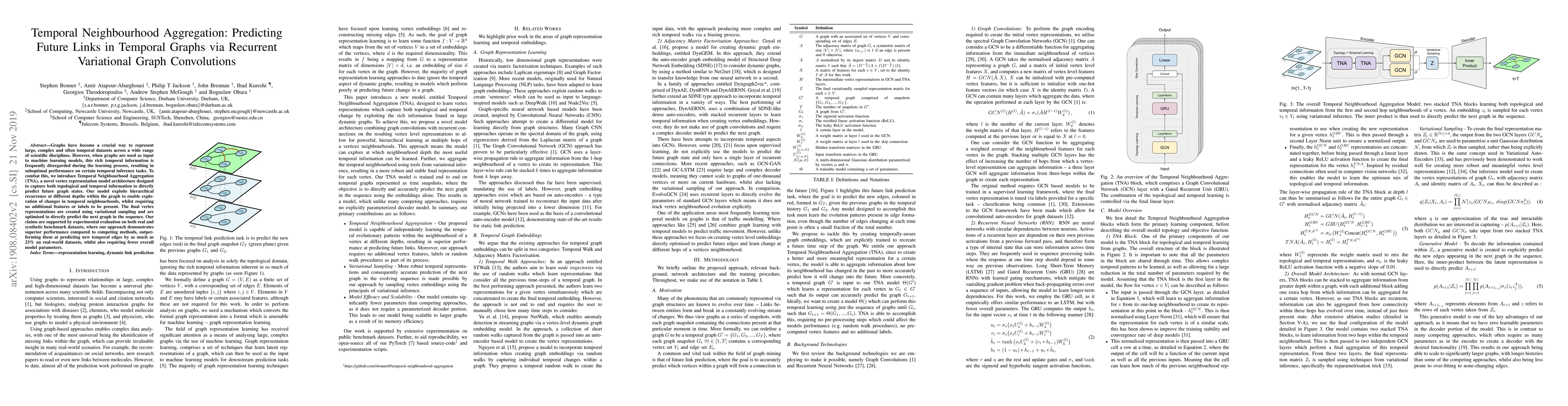 This paper introduces Temporal Neighbourhood Aggregation (TNA), a model that leverages recurrent variational graph convolutions to capture both topological and temporal information in temporal graphs, achieving superior performance in predicting future graph states compared to existing methods. Experimental results show TNA outperforms competitors by up to 23% on real datasets while using fewer parameters.
