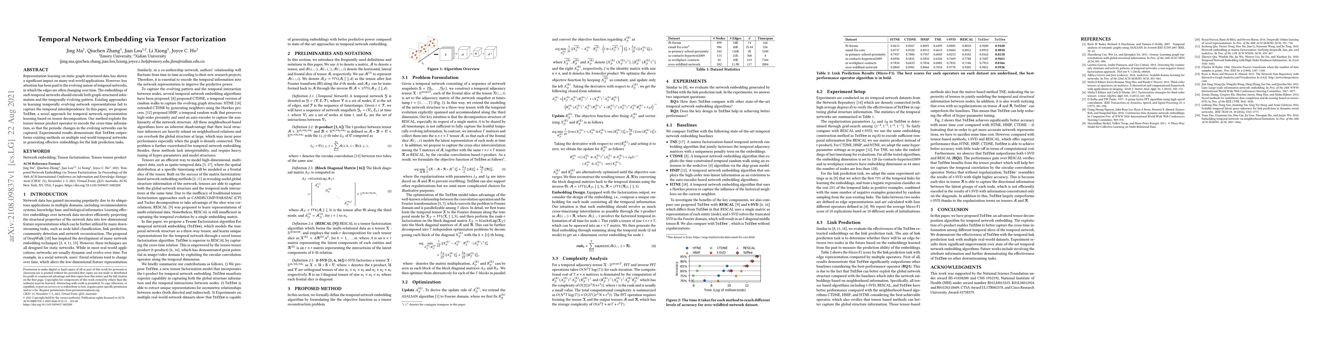 This work introduces a new method that combines the benefits of matrix factorization and tensor decomposition to achieve state-of-the-art results in temporal network embedding